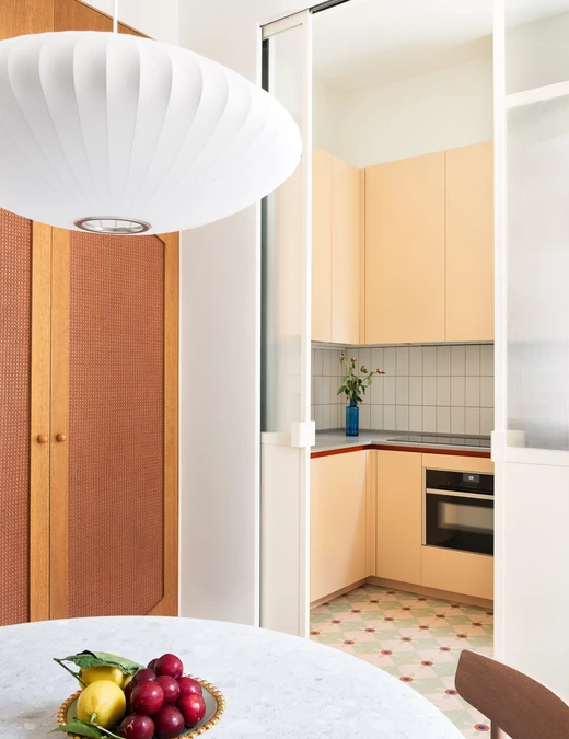 Kształt wstawek z plecionki wiedeńskiej w drewnianej zabudowie nawiązuje do gzymsów sufitowych z tynku. Dwoje przesuwnych żelaznych drzwi w kolorze masła tworzy tło, za którym kryje się kuchnia zaprojektowana na planie litery U.