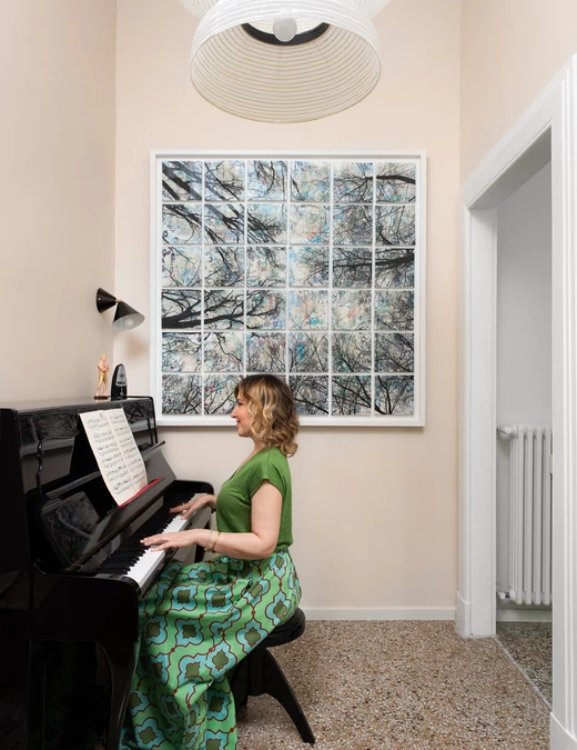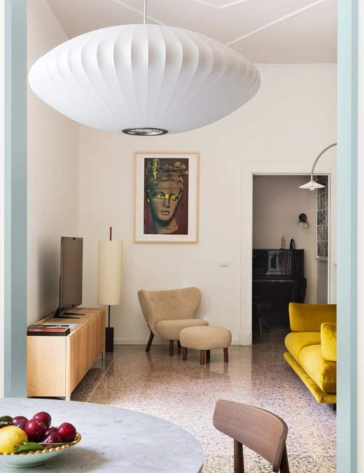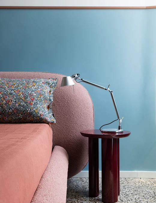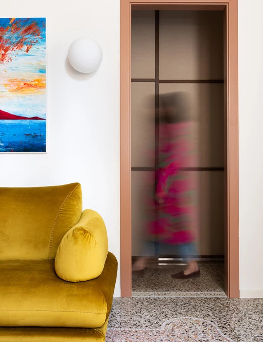 „Paleta kolorystyczna inspirowana neutralnymi tonami weneckiego terazzo, płynnie przechodzi od orzechowego do różanego, tworząc harmonijne tło, z którego wyróżnia się ochrowy aksamit sofy oraz lakierowane drewniane detale, które nie przytłaczają przestrzeni” - opowiada Matilde Masi.