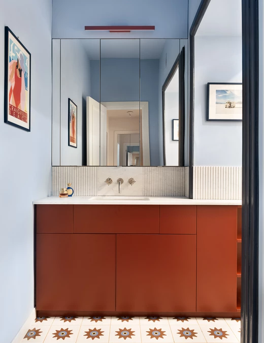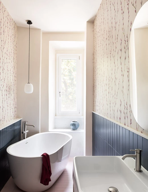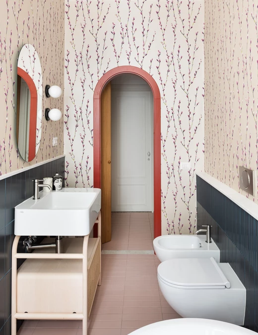 Architekci botaniczną tapetę połączyli z „lamperią” z niebieskich płytek ceramicznych wykończonych bordiurą z białego marmuru Carrara. Podłoga płynnie przechodzi między dwoma pomieszczeniami, tworząc neutralne różowe tło, które uzupełnia zaokrąglona szafka łazienkowa z jesionu.