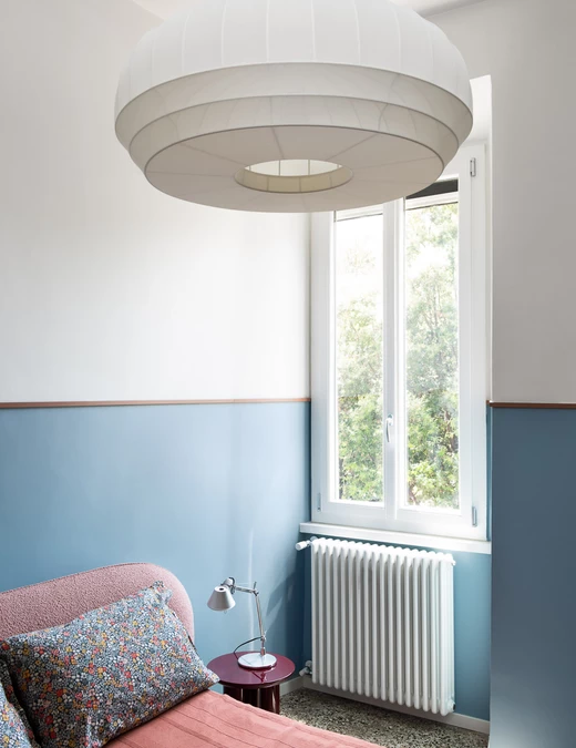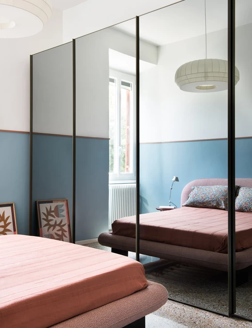 Dwa celowo małe pokoje sypialne łączy wspólny element – błękitna lamperia zakończona lakierowanymi drewnianymi listewkami. W głównej sypialni znajduje się szafa z przesuwnymi drzwiami pokrytymi przyciemnianym lustrem, co optycznie powiększa przestrzeń i odbija łóżko z profilami pokrytymi różową tkaniną boucle. Nad meblem zawisła lampa z lekkiej gazy od marki Northern Lighting. W sypialni gościnnej znajduje się sofa z materacem w kolorze śliwkowym oraz duża wisząca lampa od marki Gropius Lamp.