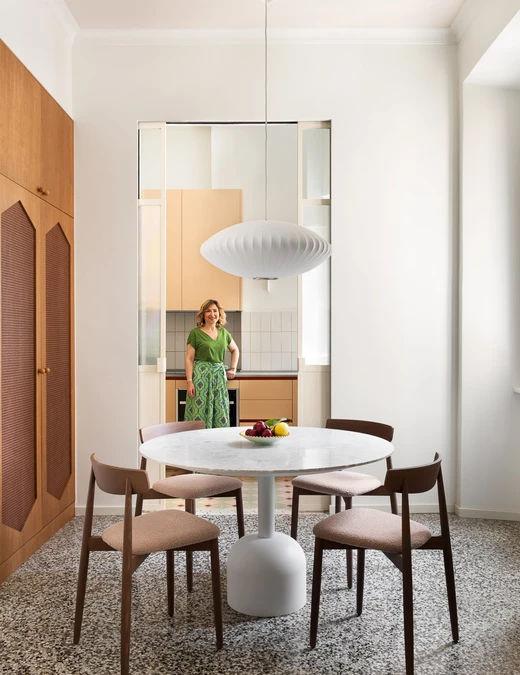 Jadalnia, pomiędzy salonem a kuchnią, stała się centralnym punktem mieszkania. Okrągły stół z białego marmuru i jedyne wiszące oświetlenie w strefie dziennej podkreślają tę rolę.