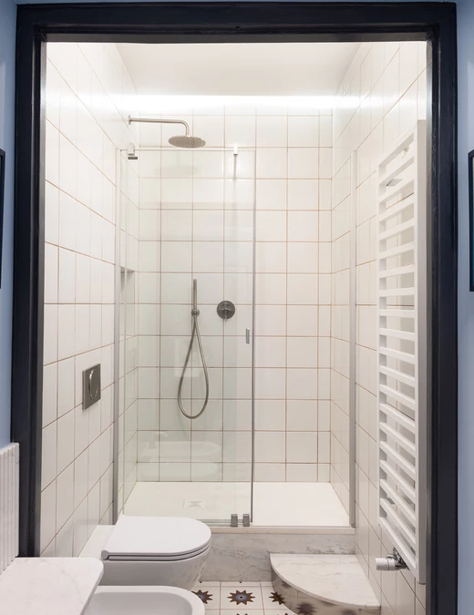 Układ łazienki w części sypialnej, wydzielonej z dodatkowej przestrzeni w korytarzu, dzieli ją na dwie odrębne strefy przy zachowaniu śladu pierwotnego otworu drzwiowego. Dzięki temu zabiegowi architekci oddzielili strefę umywalki z wyrazistą burgundową szafką naprzeciwko drzwi wejściowych od strefy prysznicowej utrzymanej w zimnych tonach.