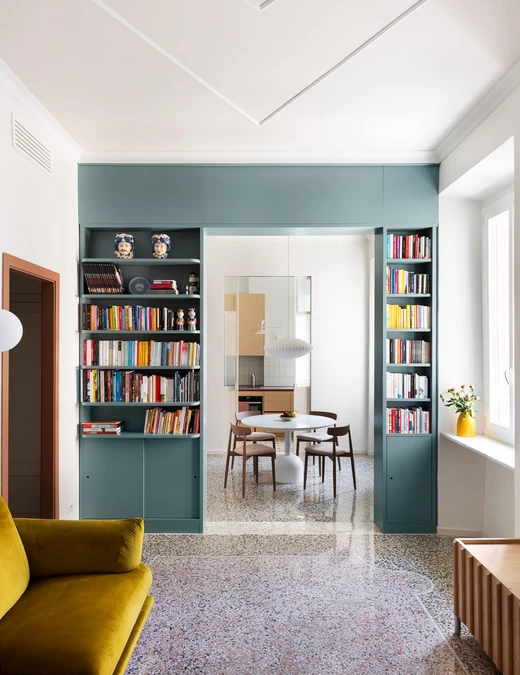 Duży hol wejściowy prowadzi do części dziennej, gdzie sekwencja pomieszczeń jest podkreślona przez regał w kolorze pudrowego błękitu między salonem a jadalnią oraz przesuwnymi drzwiami z żelaza i szkła, oddzielającymi kuchnię od części dziennej.