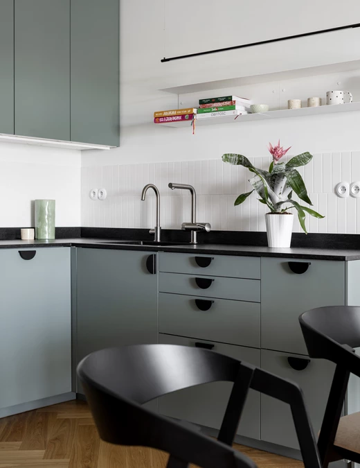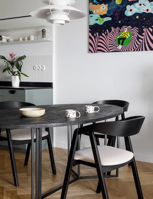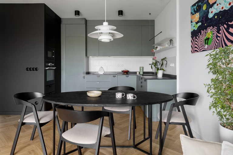 Projektantka zdecydowała się na pozostawienie otwartej kuchni. By zachować ergonomię i proporcje tej strefy, zamiast półwyspu wybrała długi, owalny stół z malowanego na czarno drewna mango. Zabudowę kuchenną wykonano z zielonej płyty w odcieniu szałwiowej zieleni i zestawiono ją z czarnym sprzętem AGD, który wkomponowano w ścianę o tym samym kolorze.