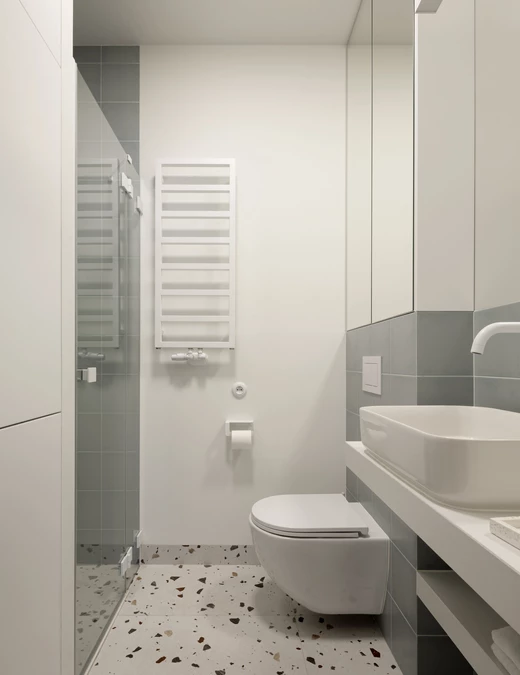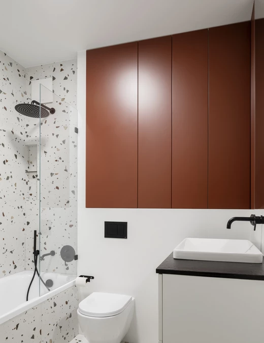 W obu łazienkach projektantka zastosowała płytki z dużym motywem terazzo. Jedno z pomieszczeń jest stonowane, wykończone jasno szarymi kafelkami i białą farbą. W drugiej z łazienek schowki wykończono frontami w odcieniu ceglastego pomarańczu.