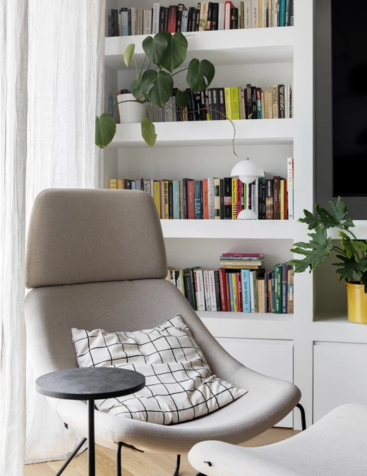 Dla właścicieli mieszkania jednym z kluczowych wymagań było też wydzielenie miejsca na pokaźną kolekcję książek. Domowa biblioteka mieści się teraz na regale w salonie, który zbudowano z płyt kartonowo-gipsowych i zintegrowano z szafką RTV oraz w biblioteczce w przedpokoju. Książki zajmują łącznie niemal 18 m2 ścian!