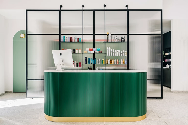 Sercem lokalu jest stalowa ściana. Wypełniona stylowym szkłem dekoracyjnym przegroda subtelnie przysłania klientów z mokrymi głowami od sali głównej. Na przeszkleniu architekt zaprojektował stalowy regał ekspozycyjny z interesującymi detalami. Rozmieszczone na nim kolorowe butelki szamponów ożywiają monochromatyczność konstrukcji.