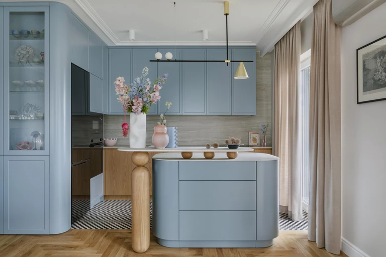 We wnętrzu dominują pastele, połączenie błękitu z różem wprowadza świeżość w przestrzeni, ale też warto zauważyć, jak te odcienie idealnie współgrają z elementami vintage, jak np. komoda w salonie. Te kolory stanowią też świetne tło do wielu dodatków, które znajdują się w tym wnętrzu. Pamiątki, grafiki, kwiaty i książki to elementy, które pokazują charakter właścicielki. Nie można nie wspomnieć o kuchni, a właściwie o wyspie kuchennej, która kradnie uwagę, a to za sprawą niezwykle oryginalnej nogi.