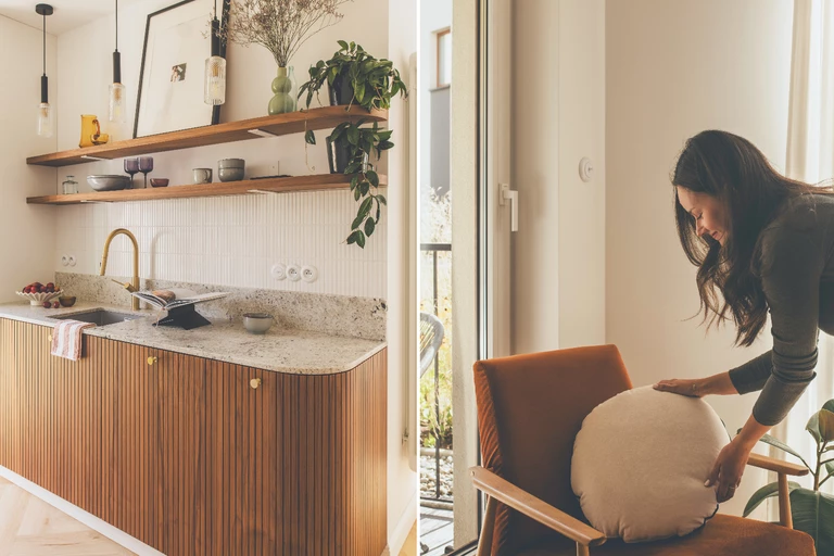 Nie mniej ważna w tym wnętrzu jest kolorystyka. Oprócz ciepłych odcieni drewna, aranżację wzbogaca oliwkowa zieleń, a całość świetnie przełamuje ruda tapicerka fotela. „Bordowe dodatki wprowadziły nieco kontrastu i podkreśliły jesienny nastrój. Lubię określać to wnętrze, jako mieszkanie z duszą, ponieważ świetnie odzwierciedla ono wyjątkowość właścicieli” - dodaje Weronika Sypuła.