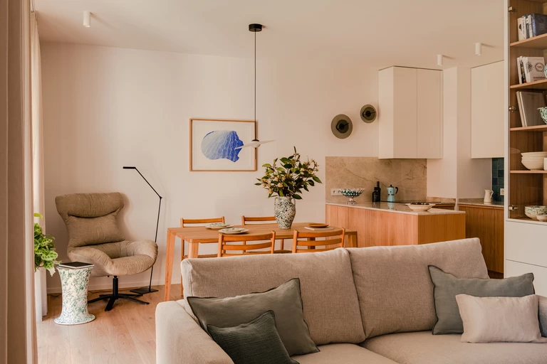 Na szczególną uwagę zasługują niebieskie, ręcznie wykonane płytki z pracowni CahaArt. To one sprawiają, że kuchnia nie jest oczywistym projektem. Fronty szafek kuchennych zostały wykonane z naturalnego drewna. Natomiast front wyspy kuchennej jest frezowany. To pierwsze miejsce, w którym dostrzegamy łukowate, faliste linie. Kolejnym jest szafka RTV. W salonie główną rolę odgrywa sofa polskiej marki Befame, która dzięki eleganckiej, melanżowej tkaninie nadaje indywidualny charakter tej części mieszkania. Całości dopełnia fotel Lungo. Drewniany stół oraz krzesła wykonane w stylu vintage zapraszają do długich rozmów z przyjaciółmi.