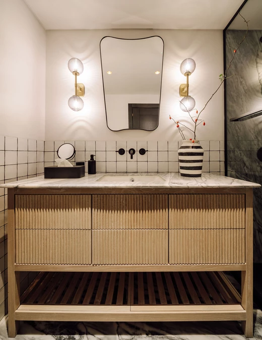 Większość mebli i elementów dekoracyjnych została zaprojektowana i wyprodukowana przez pracownię Viterbo specjalnie na potrzeby tego projektu. Należy do nich m.in. ława, stoły, ramy łóżek, szafki nocne czy stół jadalniany. Projekt stołu został zainspirowany japońską filozofią kintsugi, czyli sztuką celebrowania niedoskonałości. Mebel został wykonany z kawałka drewna, którego dziury udało się wypełnić techniką décapé.