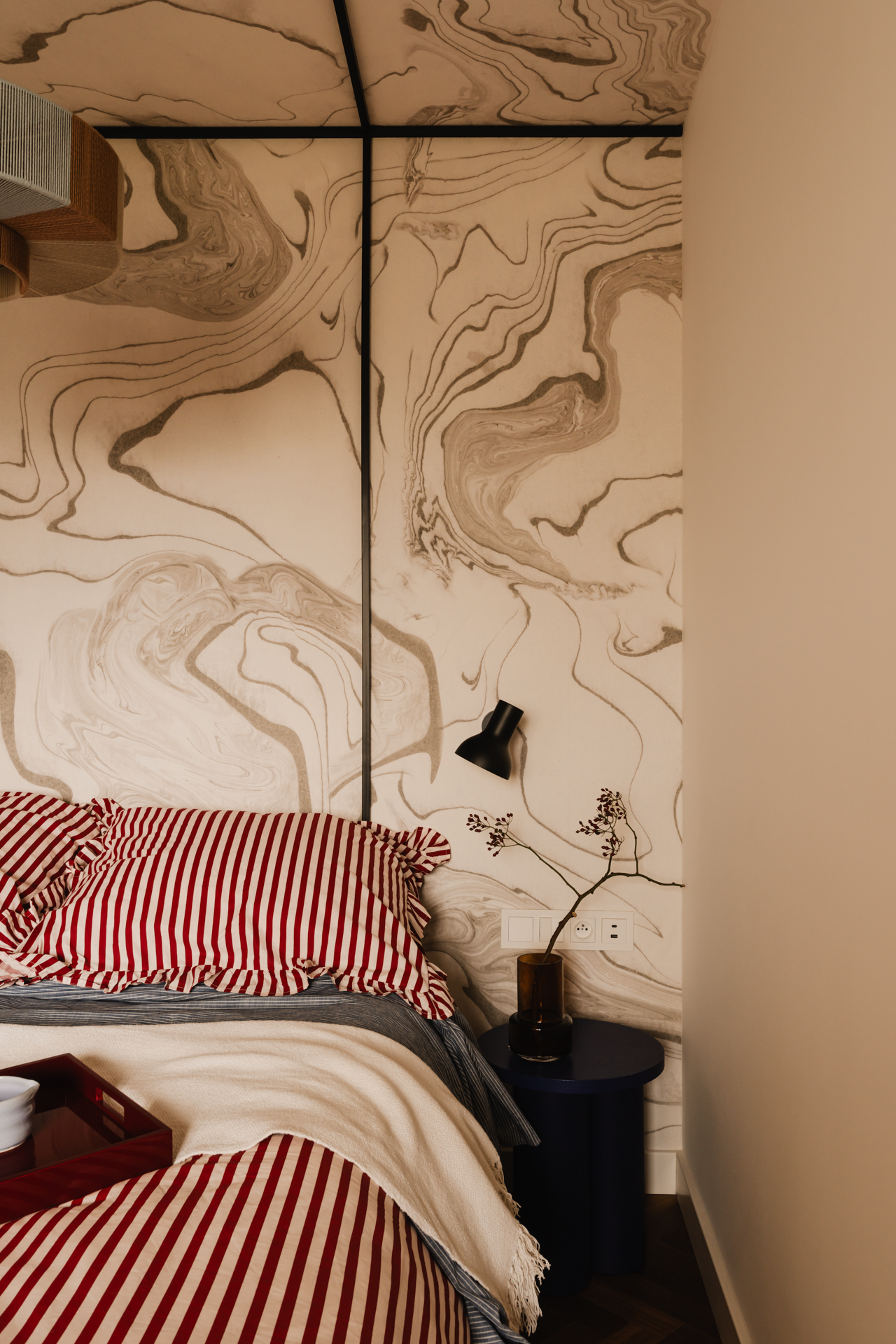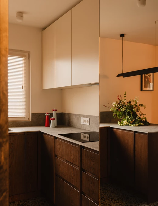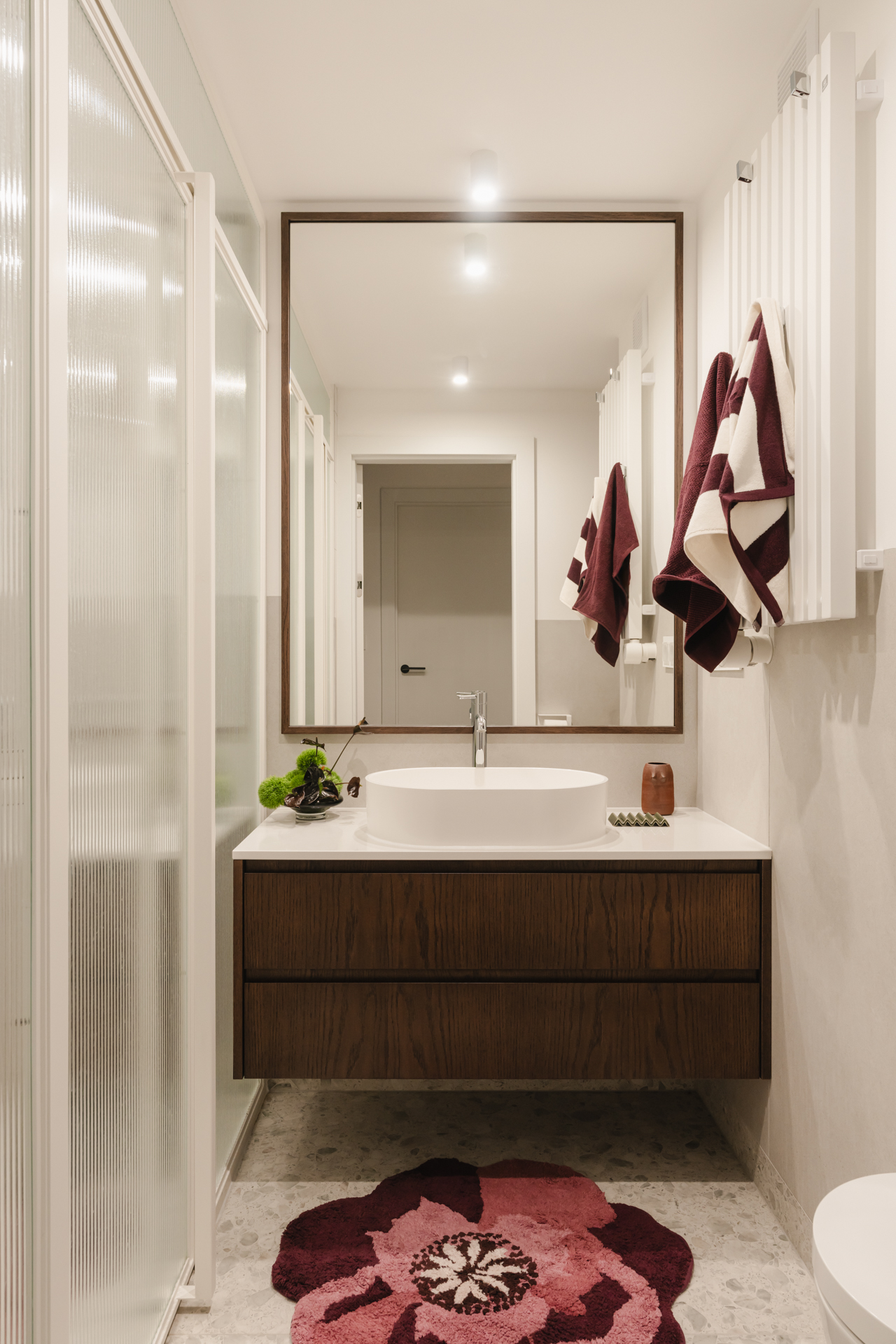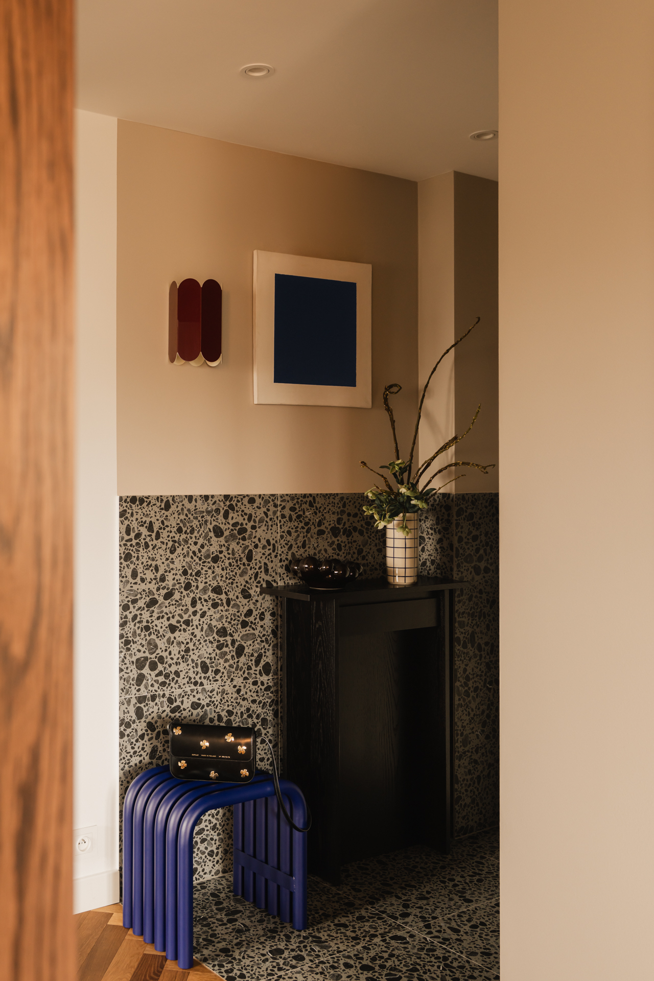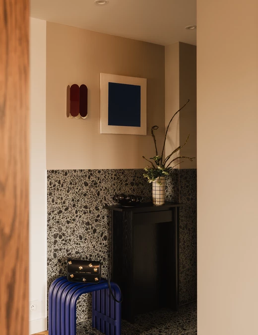 Na podłodze zastosowano niecodzienne płytki – ciemne otoczaki zatopione w jasnej masie – które powtarzają się także w przedpokoju; zarówno na posadzce, jak i na ścianach. Dodatkowo w przedpokoju znalazł się charakterystyczny bordowy kinkiet. Drobne akcenty w tym kolorze konsekwentnie przewijają się przez całe mieszkanie.