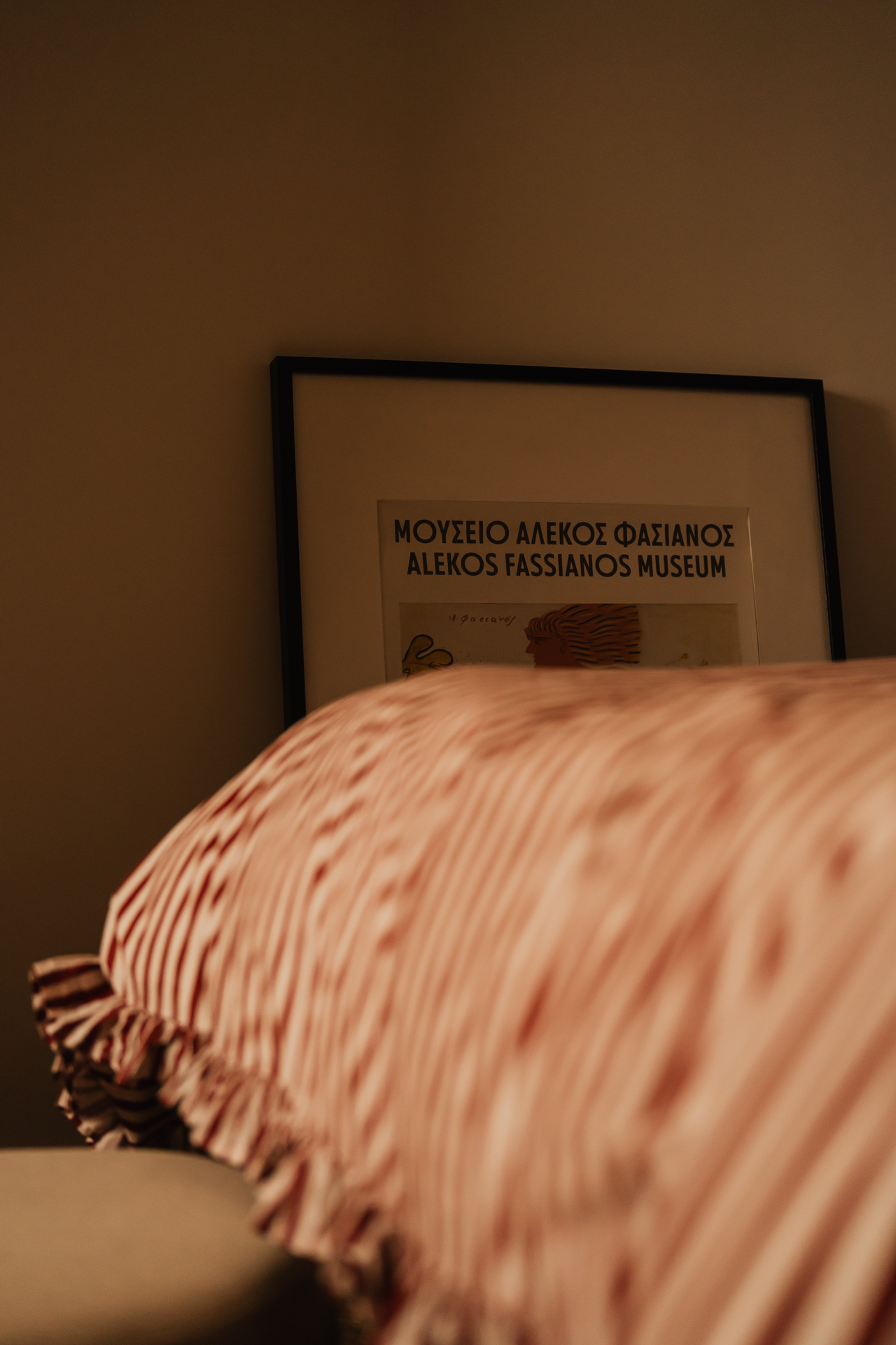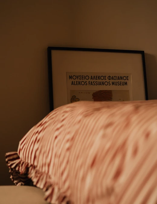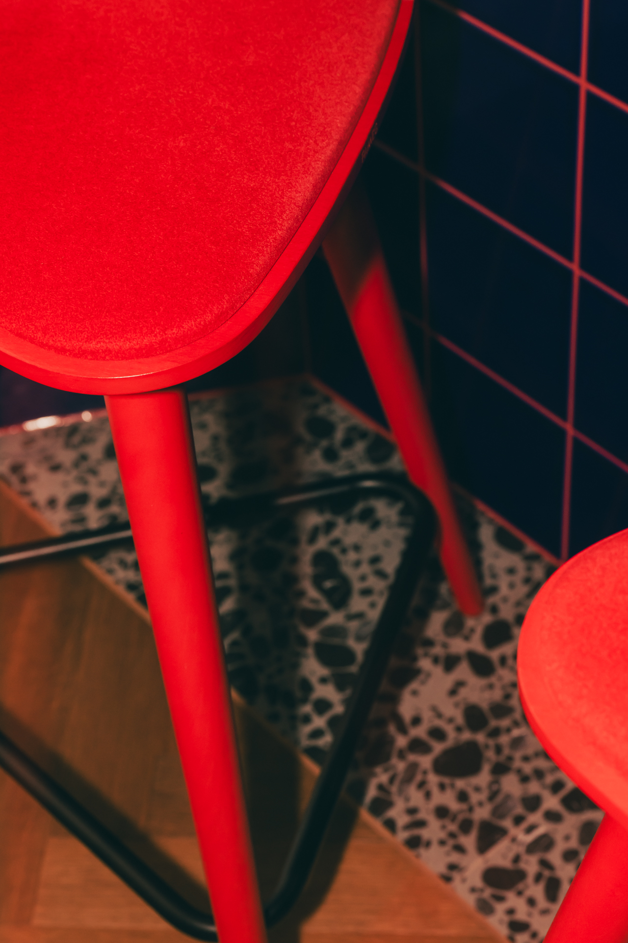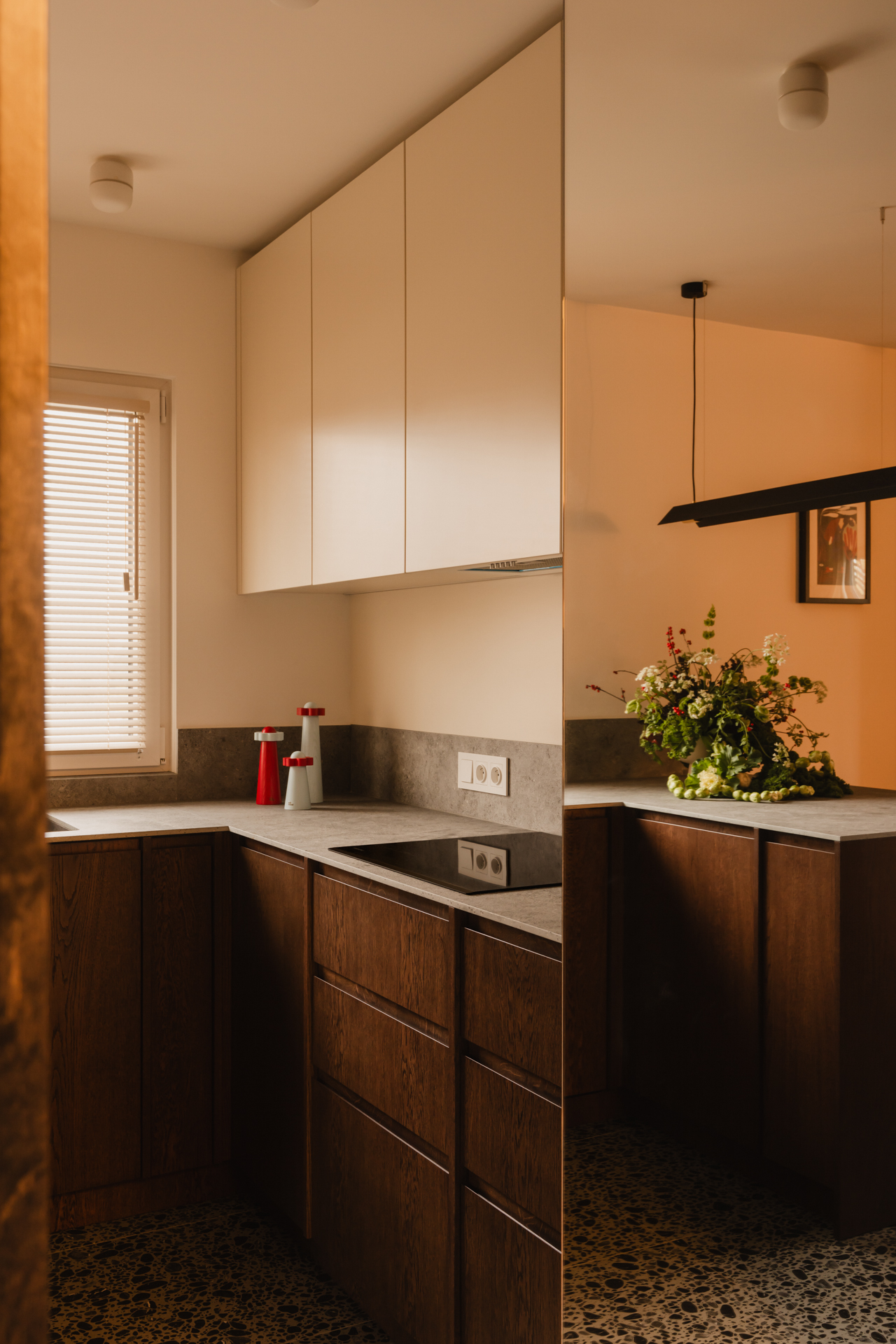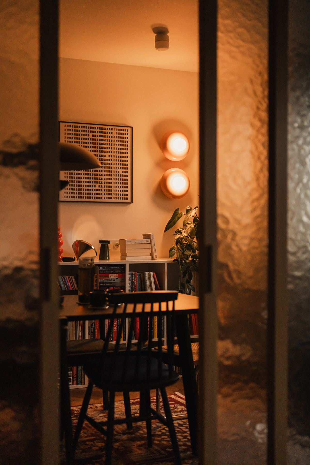 Na podłodze zastosowano niecodzienne płytki – ciemne otoczaki zatopione w jasnej masie – które powtarzają się także w przedpokoju; zarówno na posadzce, jak i na ścianach. Dodatkowo w przedpokoju znalazł się charakterystyczny bordowy kinkiet. Drobne akcenty w tym kolorze konsekwentnie przewijają się przez całe mieszkanie.