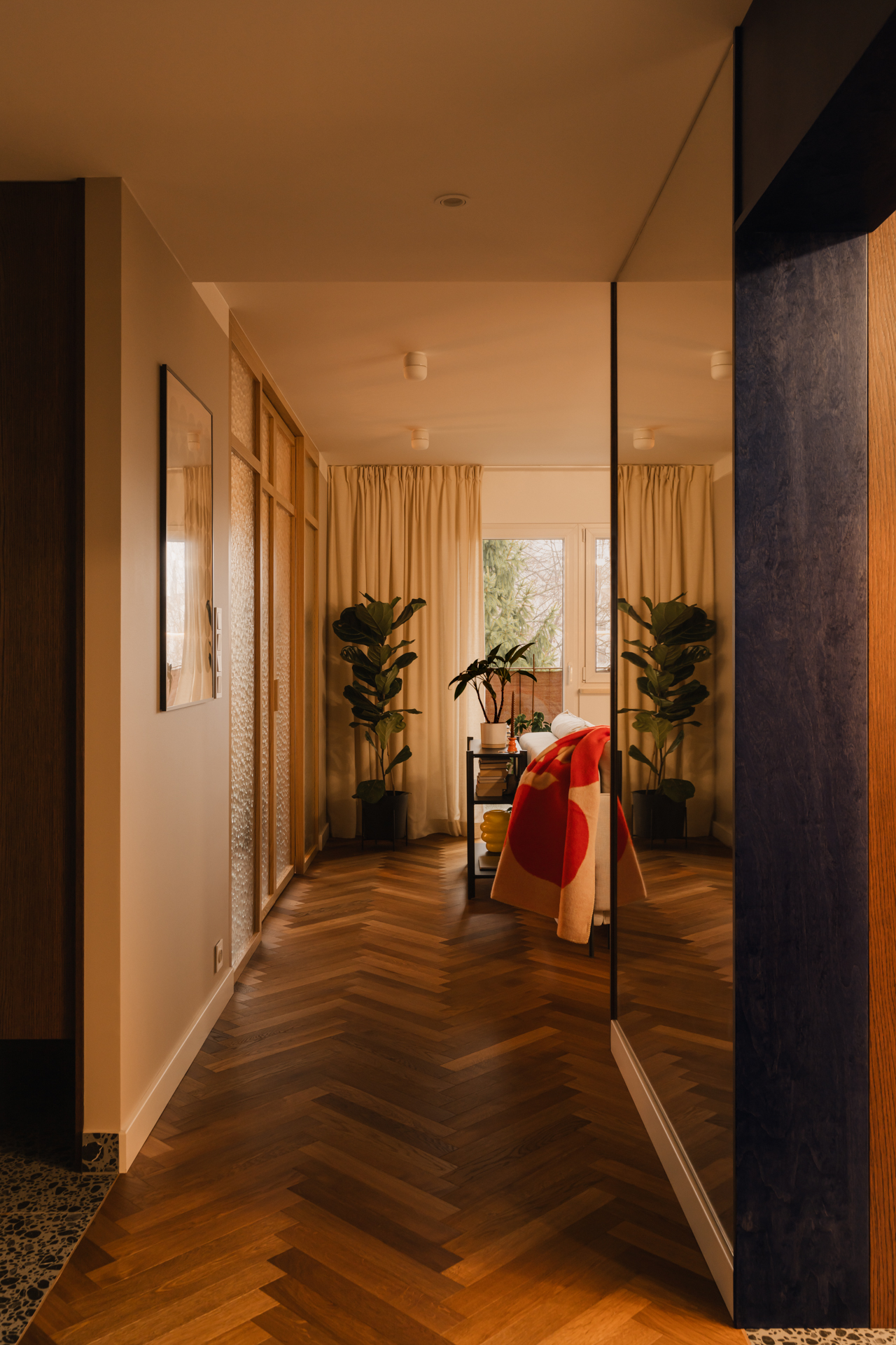Już na etapie prac projektowych zdecydowano się na istotne zmiany w układzie funkcjonalnym mieszkania. Przeniesienie drzwi w przedpokoju pozwoliło lepiej wykorzystać strefę wejściową i zaplanować tam pojemną szafę.