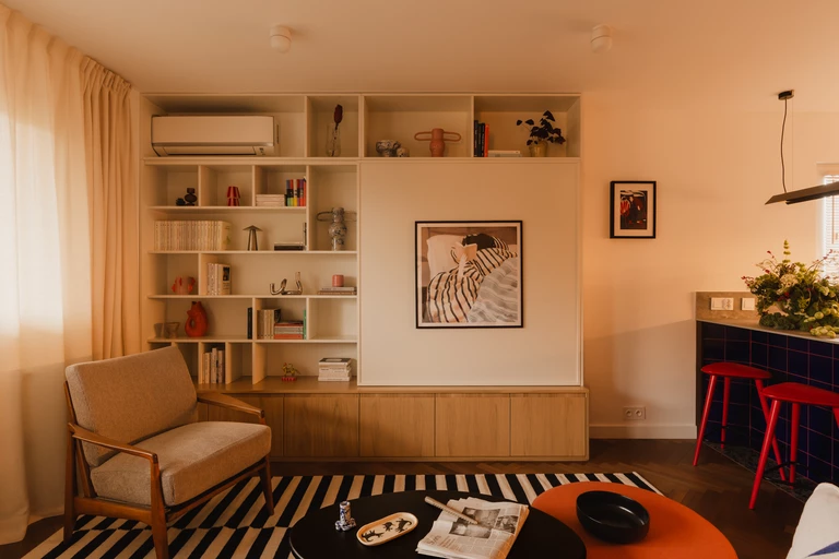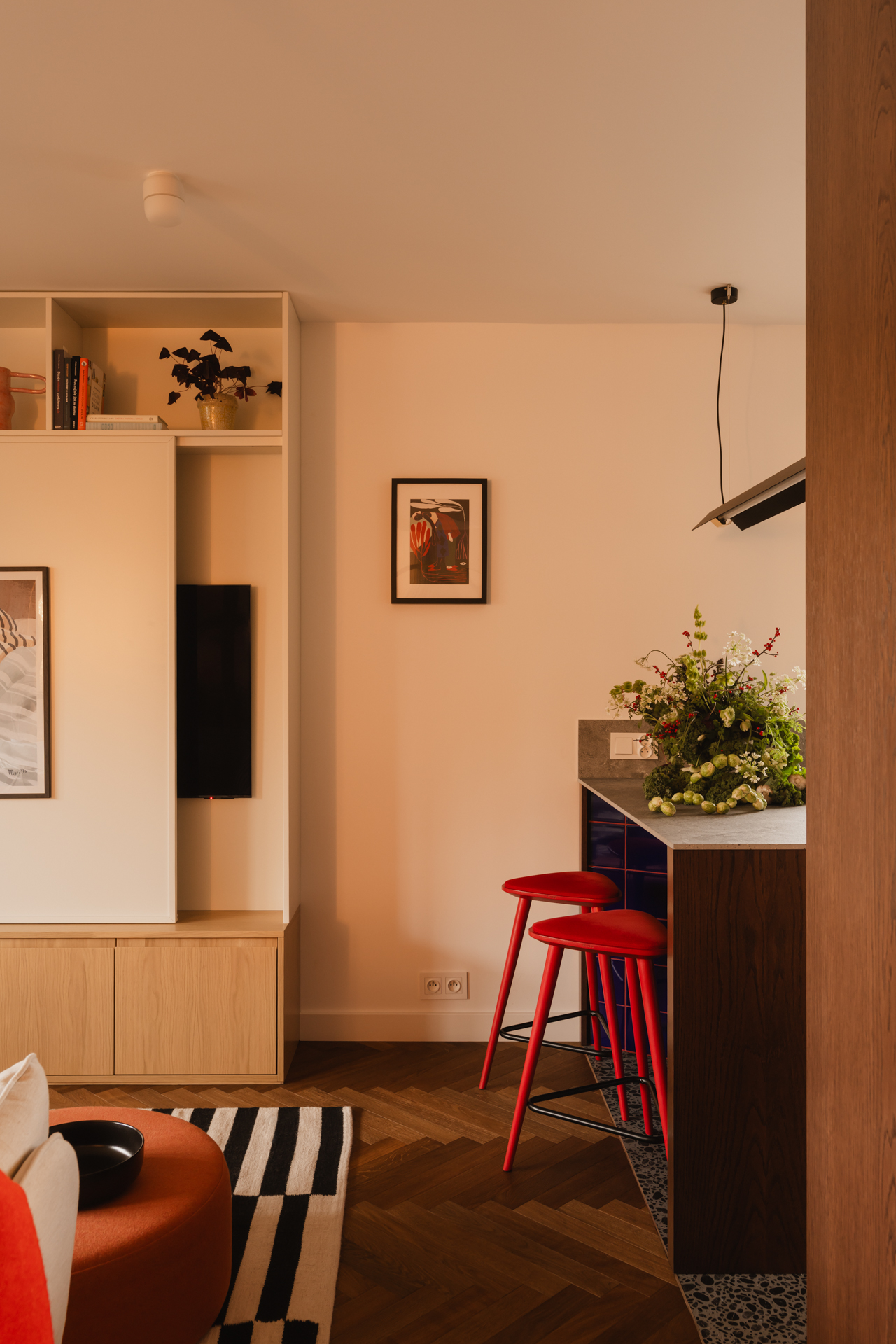 W salonie znalazł się zaprojektowany na zamówienie mebel, wyposażony w ruchomy front, za którym można ukryć telewizor. Nowoczesne wyposażenie przełamano subtelnym ukłonem w stronę designu z czasów PRL – w postaci charakterystycznego fotela. Strefę tę ożywiają dodatki, na czele z wyrazistym, pomarańczowym pufem.