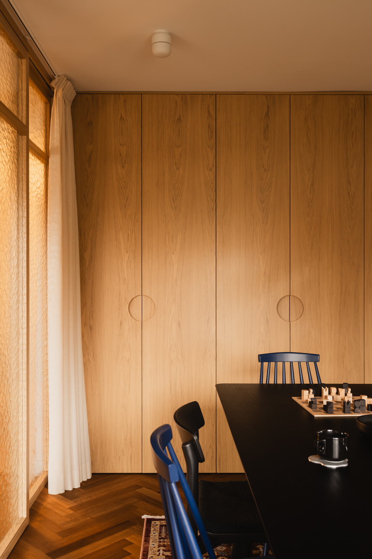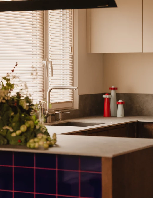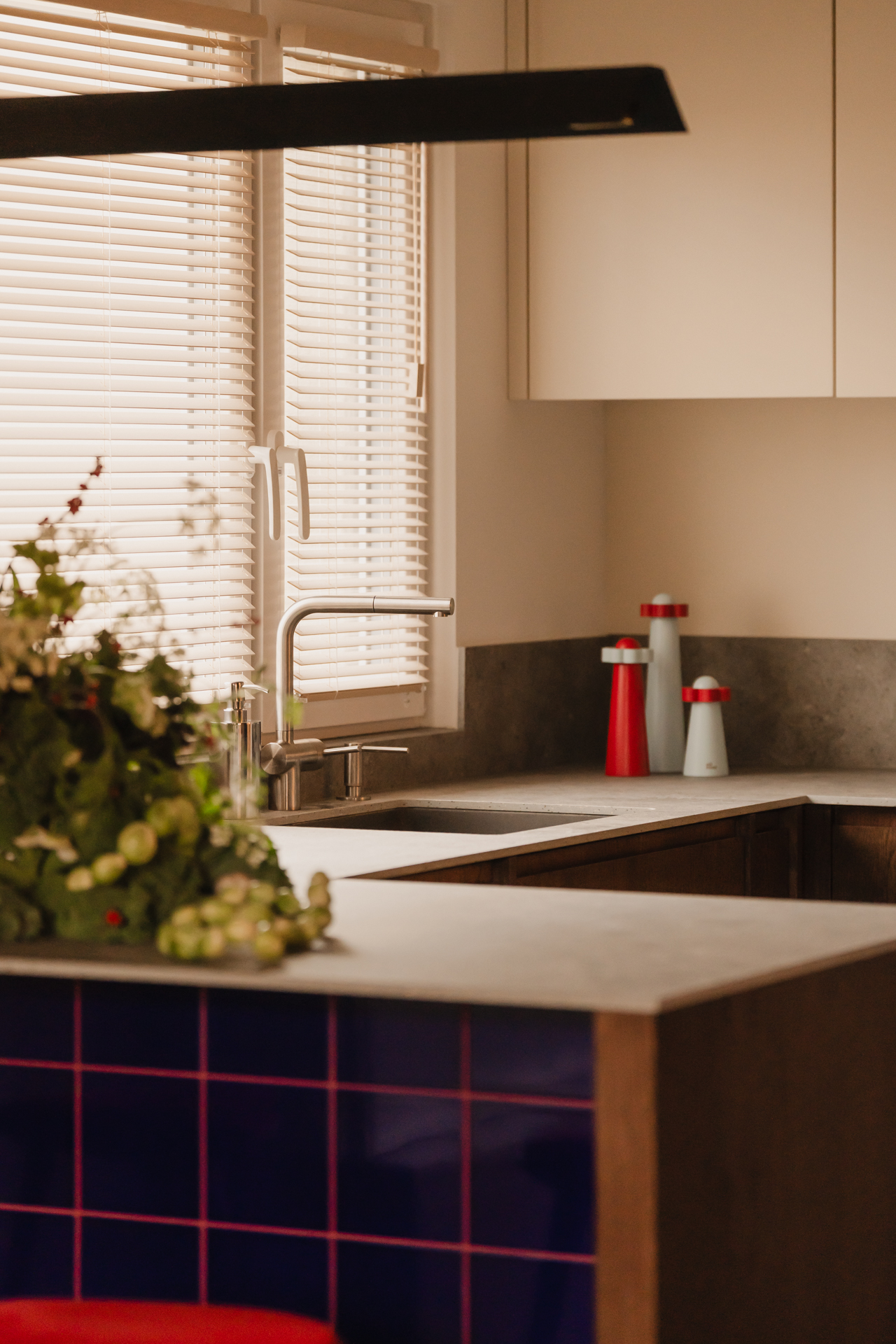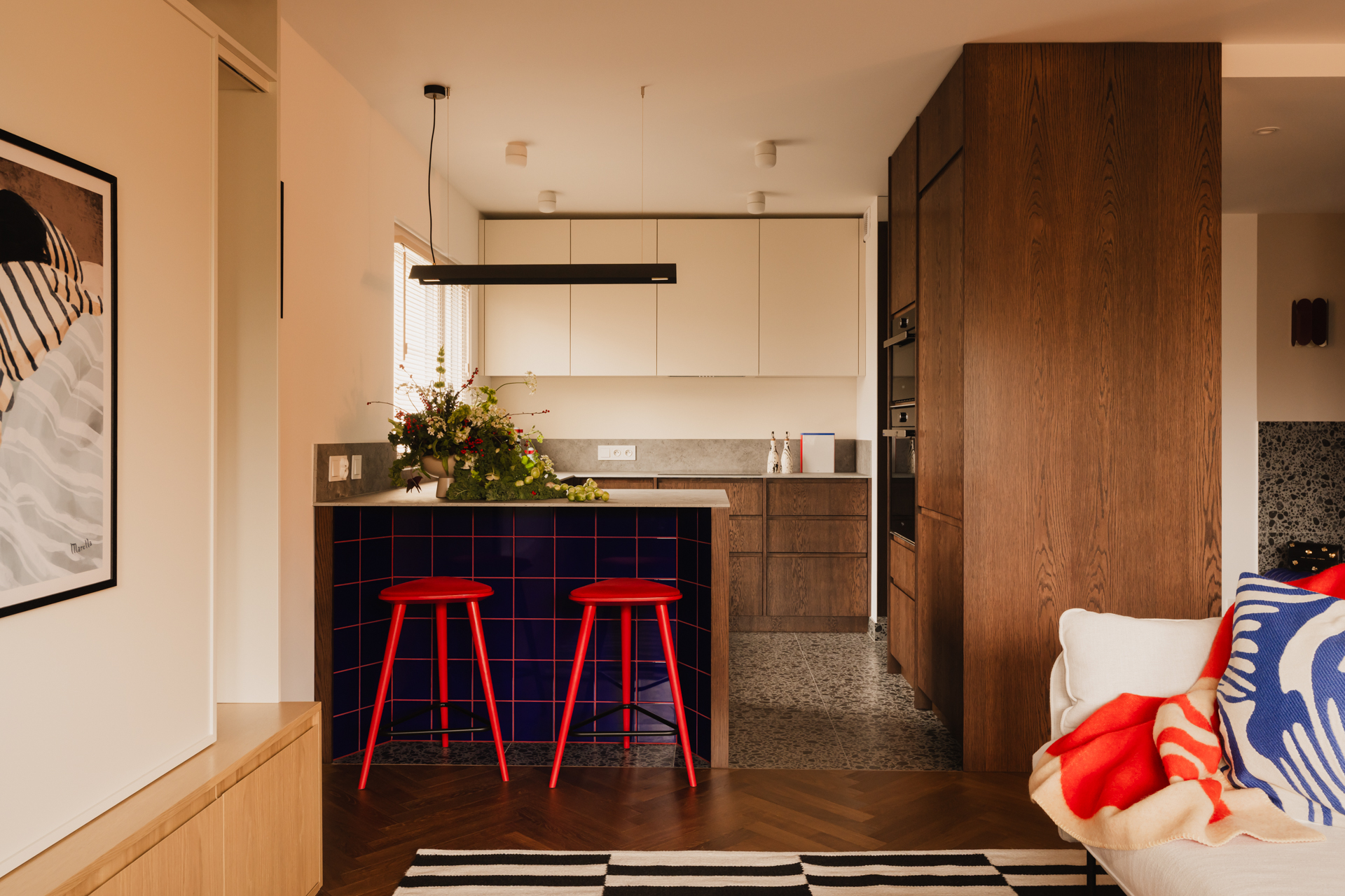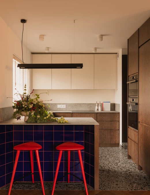 Kuchnia jest elegancka, ale wyrazista. Dolna zabudowa została wykonana z forniru, natomiast górne szafki utrzymano w kolorze zgaszonej, ciepłej bieli. Centralnym punktem stała się wyspa z wnęką na hokery, wykończona intensywnie granatowymi płytkami. Ten sam kolor pojawia się również w portalu prowadzącym z korytarza do kuchni, spinając wizualnie całą tę strefę.
