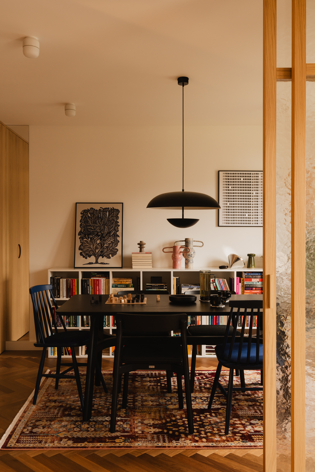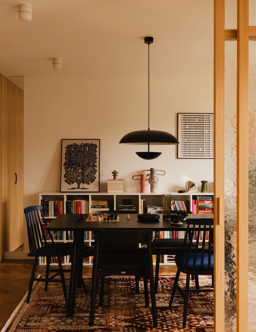 Nowa jadalnia to serce mieszkania – wielofunkcyjne centrum, które służy do spotkań z przyjaciółmi, pracy, czytania książek czy grania w planszówki. Umieszczono tu niski regał idealnie dopasowany do potrzeb Inwestorki, a także miejsce na dużą i, co najważniejsze, pojemną szafę.