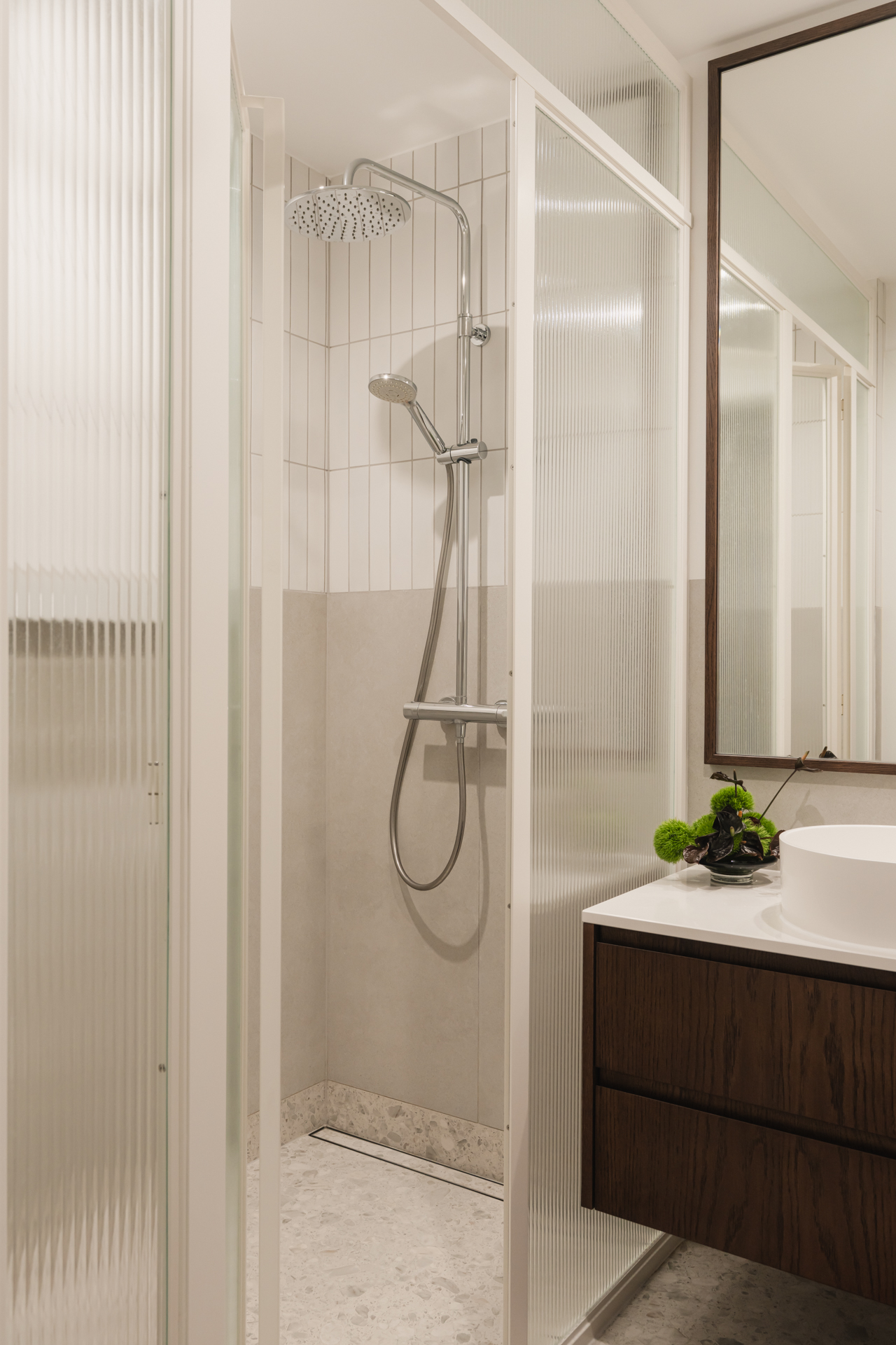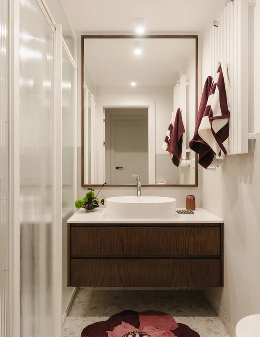 Łazienka, zgodnie z wytycznymi, utrzymana jest w spokojnym i subtelnym tonie. Znajdziemy tu fornirowaną szafkę pod umywalkę oraz lustro w drewnianej ramie. Na podłodze pojawiają się płytki nawiązujące do tych z kuchni i przedpokoju, jednak w jaśniejszej, nieco delikatniejszej wersji.