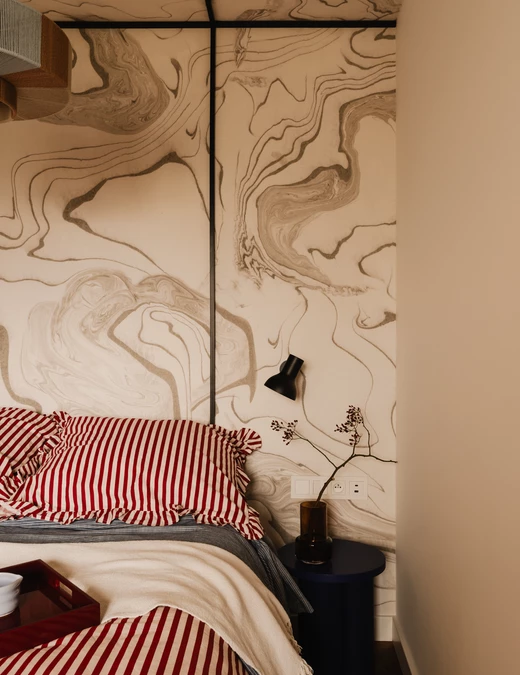 Wcześniej ciszę i spokój w sypialni zaburzał nieprzyjemny pogłos, dlatego zastosowano tu tapety i lamele, co nie tylko wzbogaciło wnętrze wizualnie, ale także poprawiło jego akustykę.