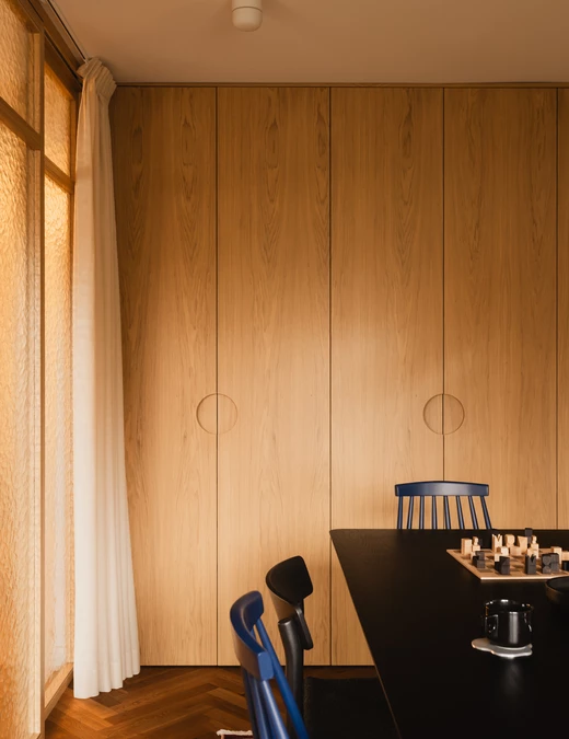Sypialnię ulokowano w pomieszczeniu, które wcześniej nie miało jasno określonej funkcji, natomiast dawna nocna strefa zyskała zupełnie nowe życie jako jadalnia otwarta na salon. Przestrzenie te można – w razie potrzeby – oddzielić za pomocą przeszklenia w drewnianej ramie.