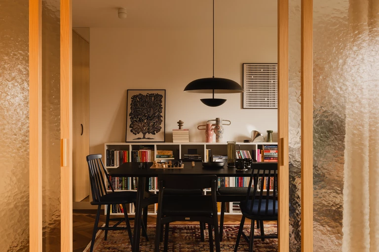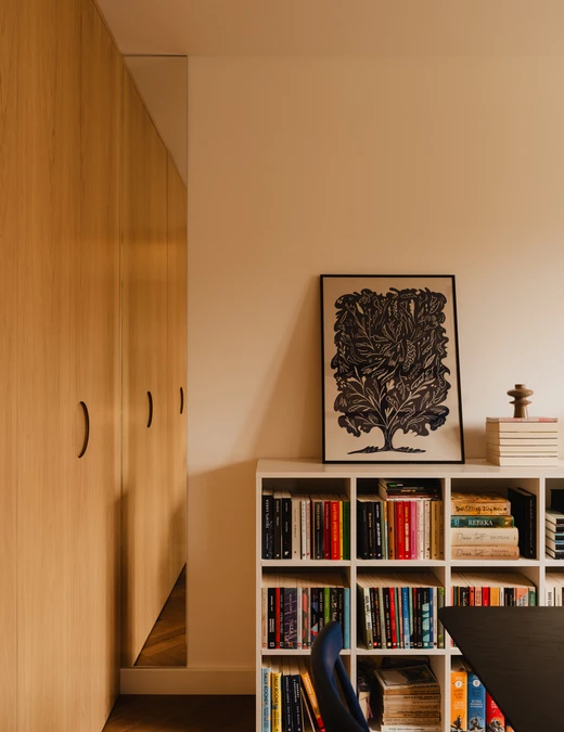 Projekt pracowni KONTRAFORMA to aranżacja mieszkania na krakowskich Czyżynach, zaprojektowana dla młodej pary wielbicieli literatury, którzy często pracują w trybie zdalnym. Wnętrze musiało więc być funkcjonalne, wygodne i estetyczne, a jednocześnie gotowe pomieścić imponującą kolekcję książek.