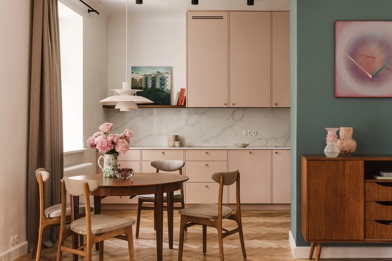 W mieszkaniu w warszawskiej kamienicy z lat 20. szczególną uwagę zwraca skąpana w różu zabudowa kuchenna. Doskonale komponuje się z marmurem Noble Carrara oraz sąsiadującą z nią ścianą pomalowaną na odcień butelkowej zieleni.