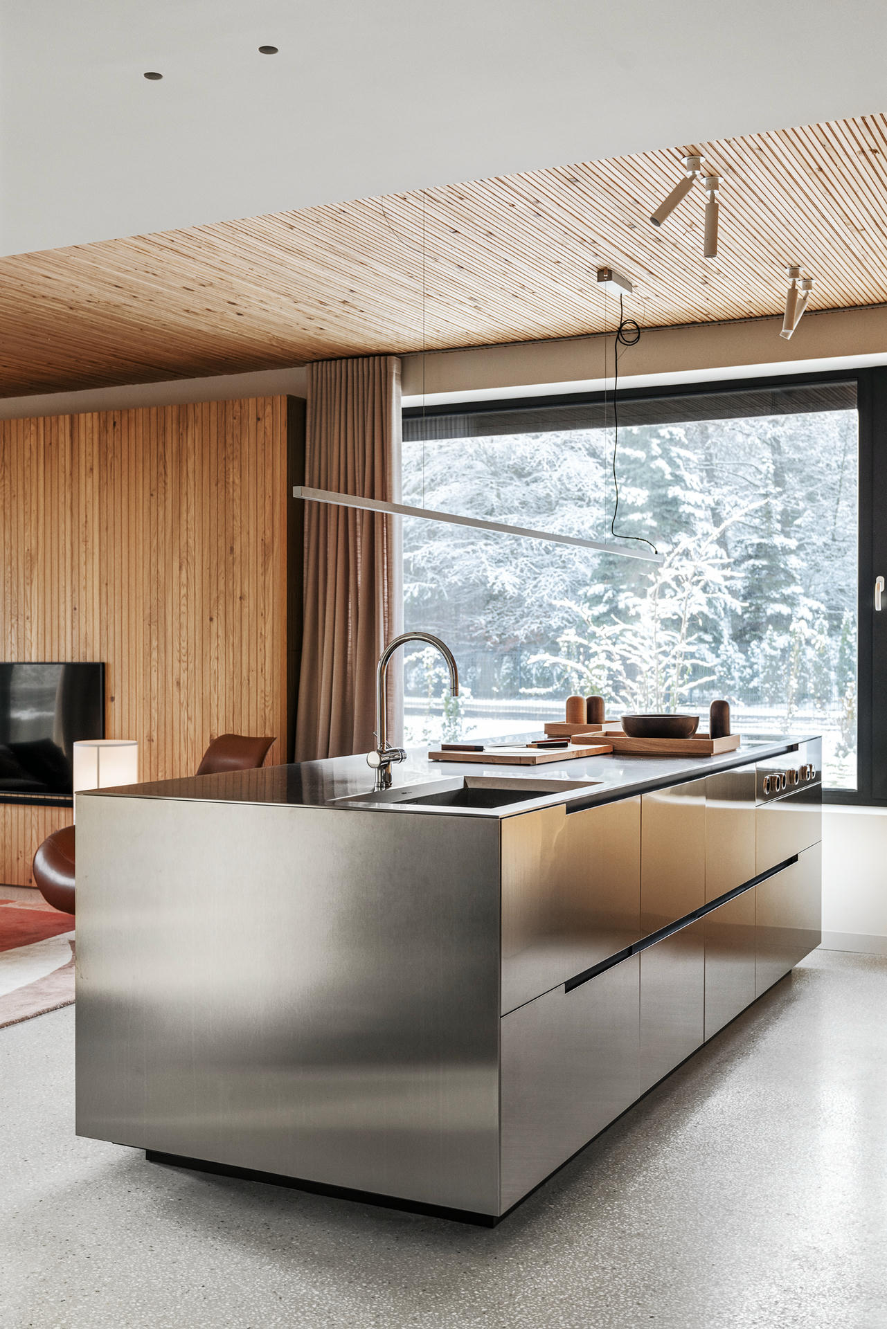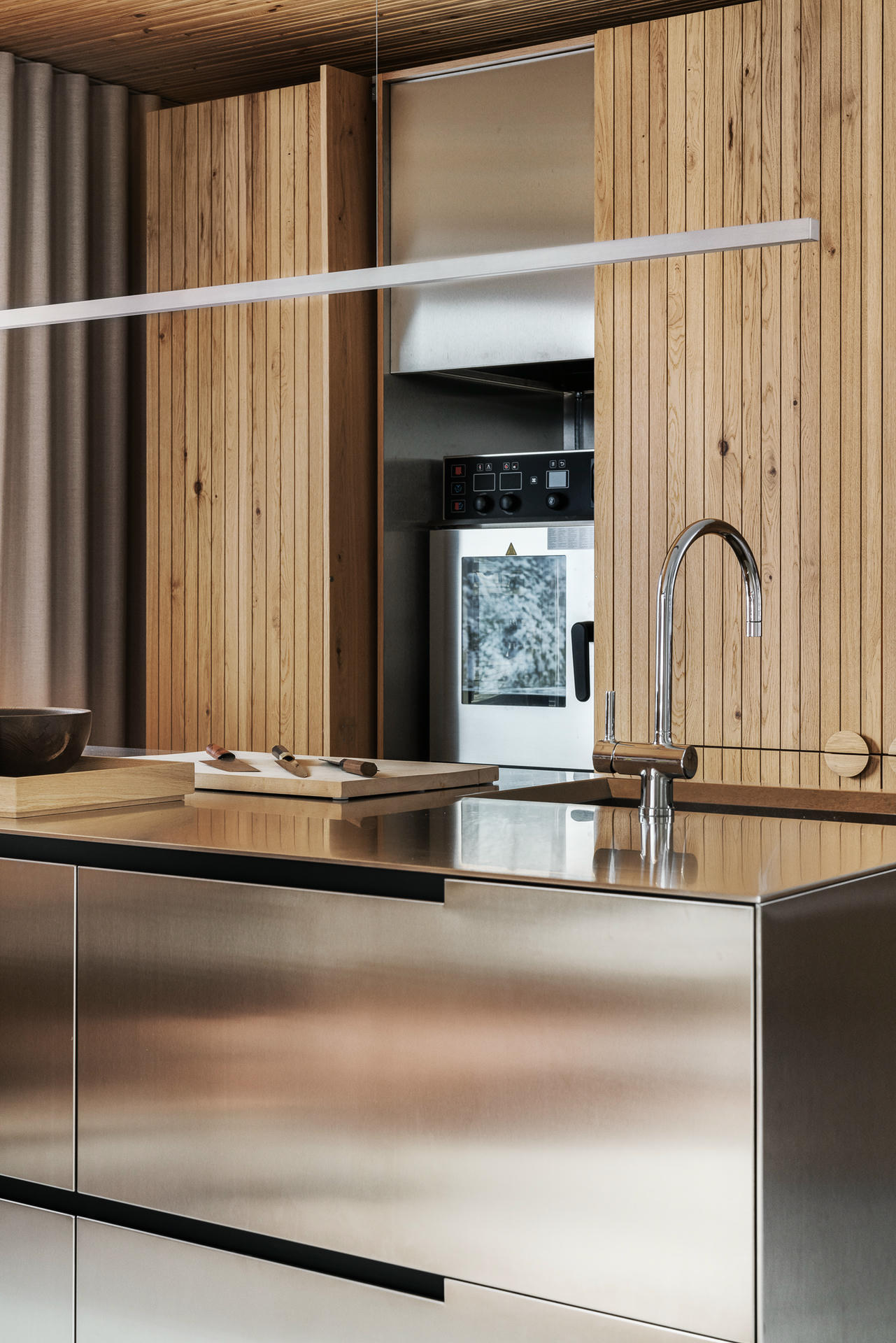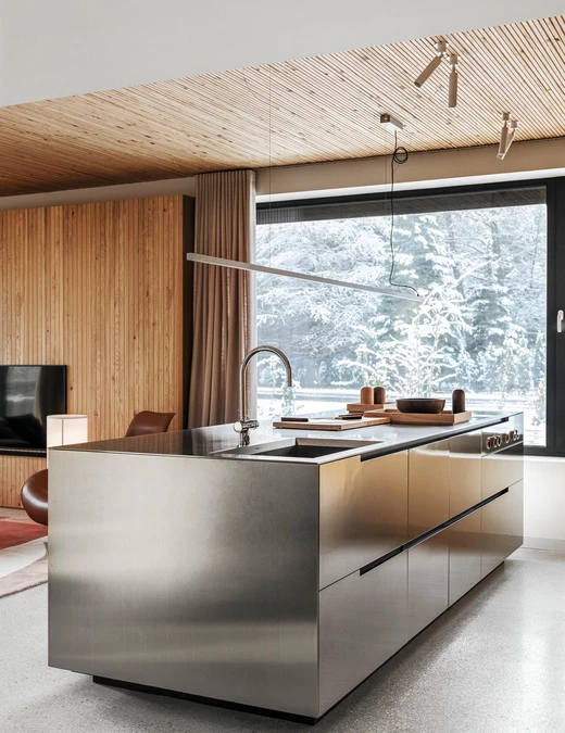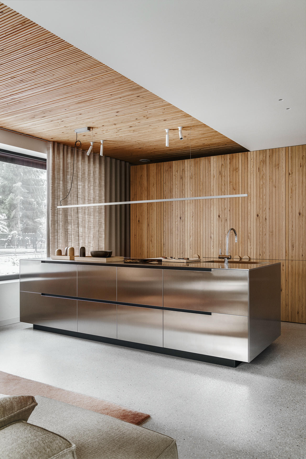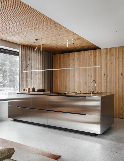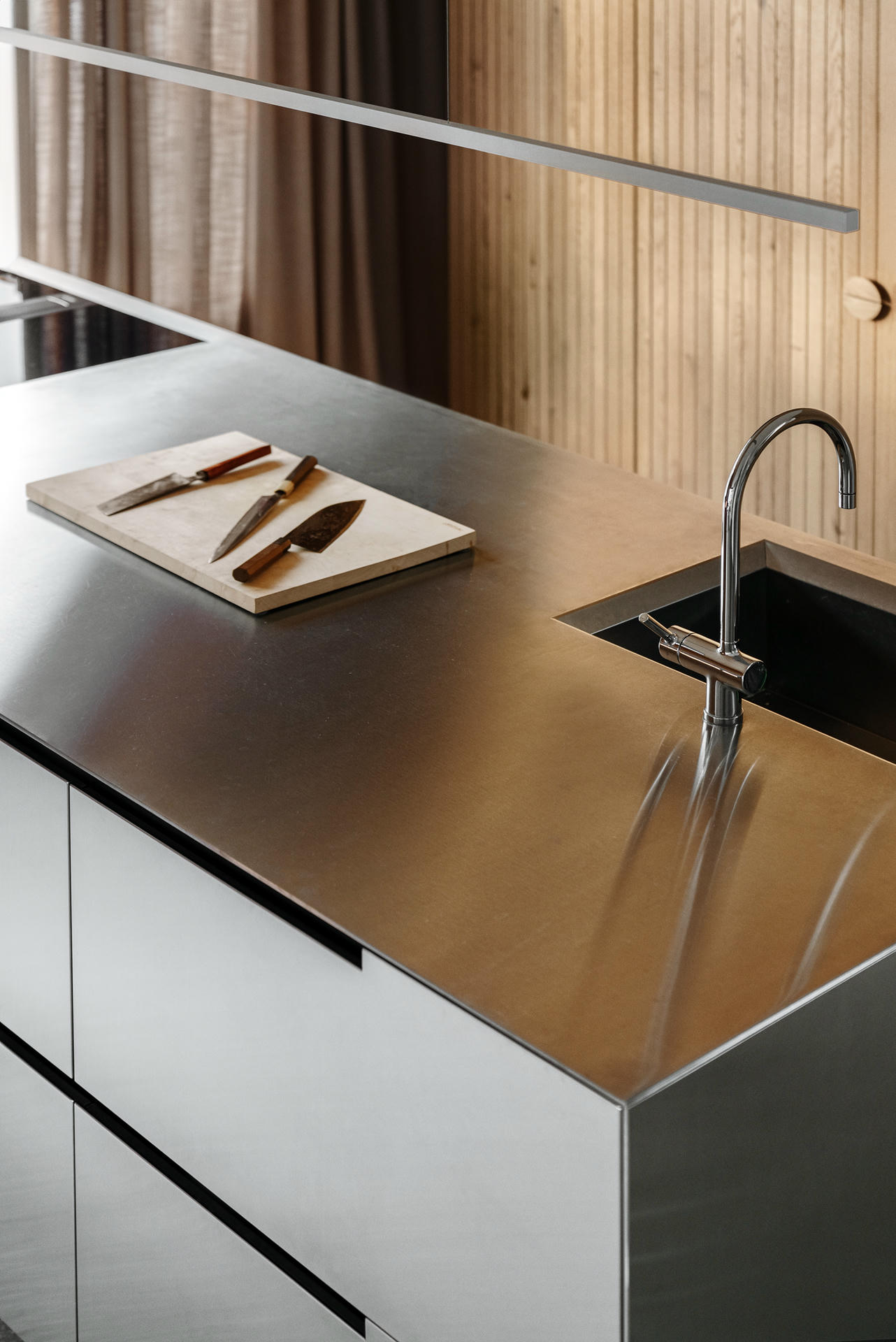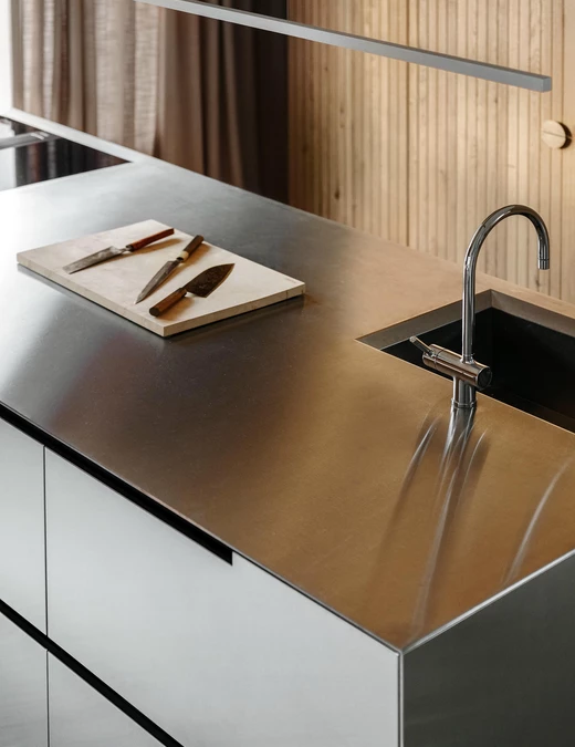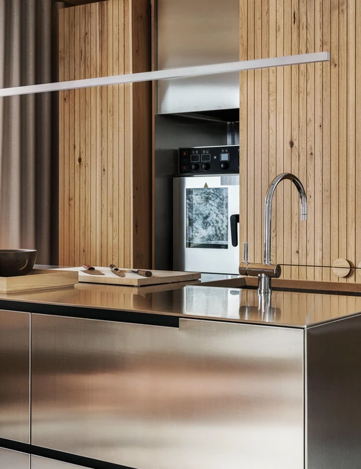 Od początku planowali, że ten wyjątkowy mebel powstanie ze stali nierdzewnej, nawiązując do profesjonalnych kuchni gastronomicznych, ale w nieco bardziej domowym wydaniu. Wybór padł na model PHOENIX marki Poliform – klasykę współczesnego designu. Szczotkowane fronty subtelnie odbijają światło i fragmenty otoczenia, dzięki czemu masywna zabudowa nabiera lekkości.