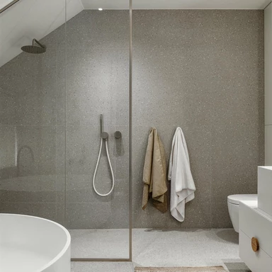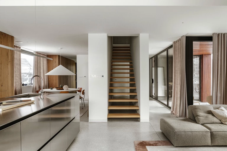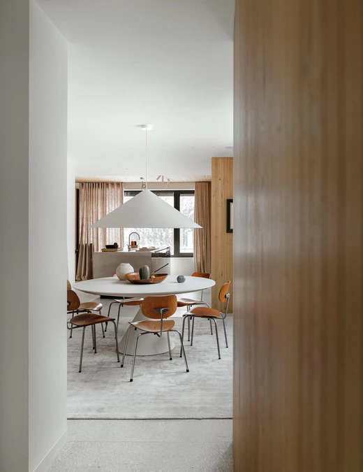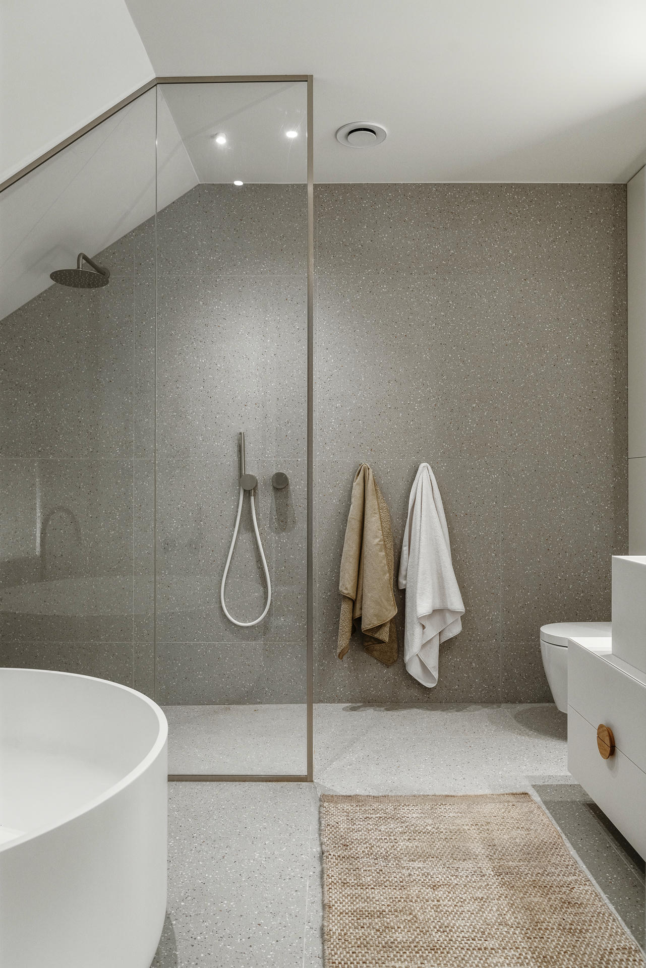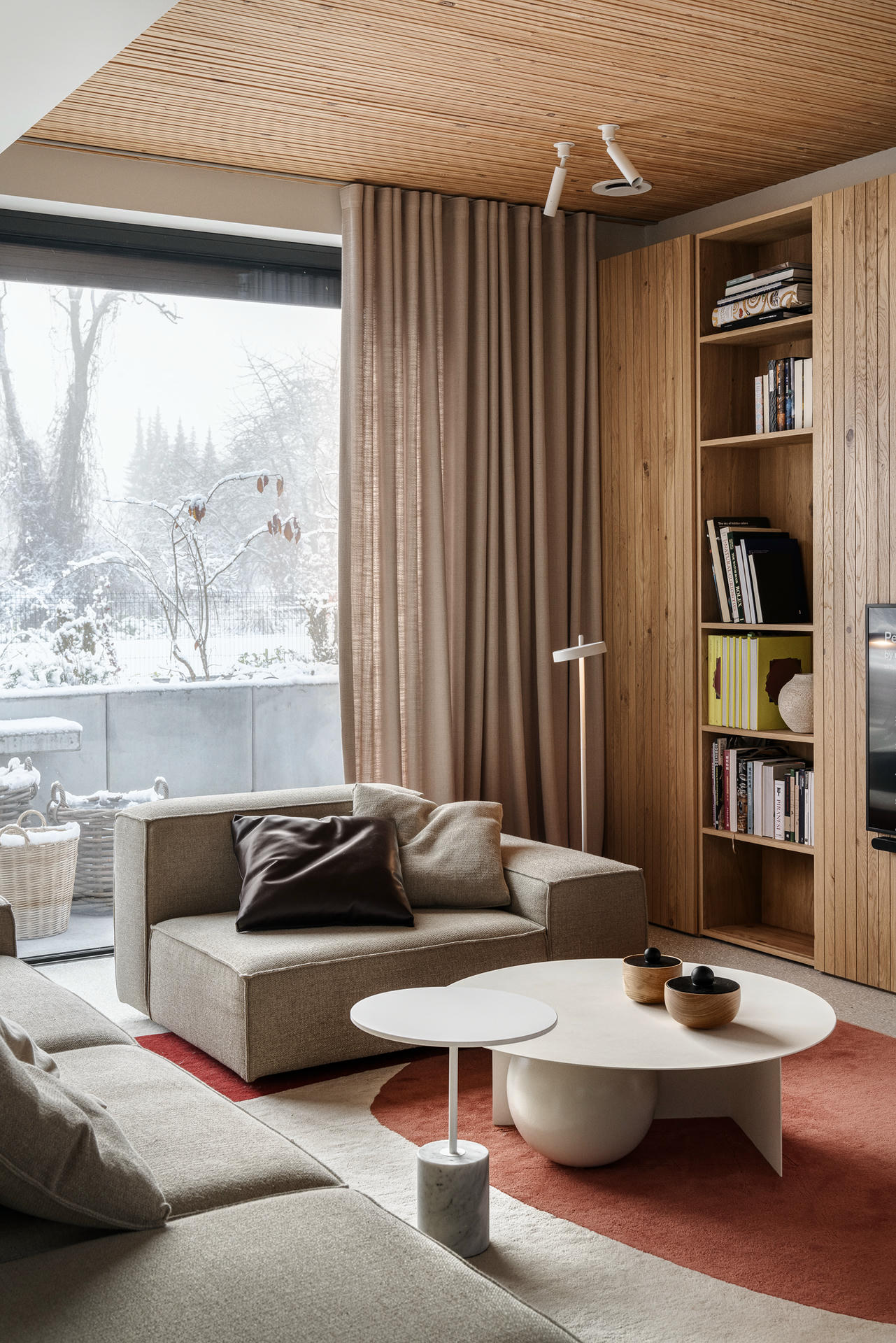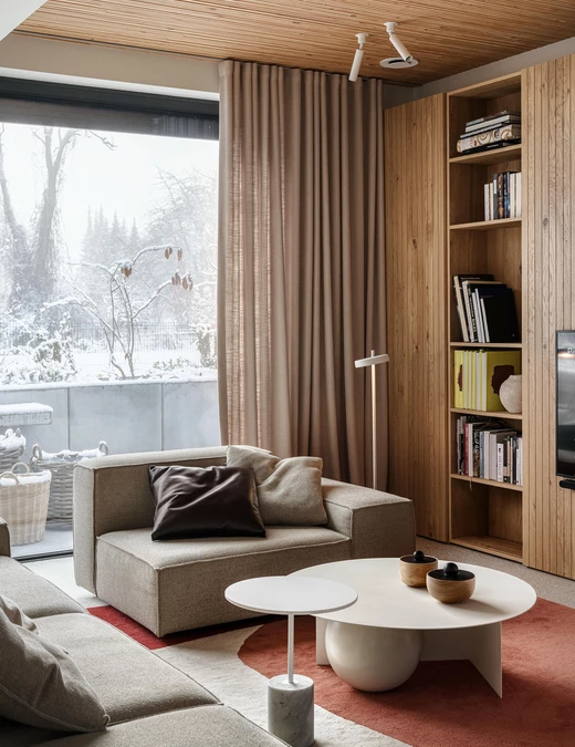 Wysokości zabudów i sufitów podwieszanych wyprowadzono z poziomu okien – w ten sposób powstała uporządkowana kompozycja. Na całym parterze, w tym również na tarasach, pojawiła się posadzka z lanego i szlifowanego betonu o efekcie lastryko. Choć materiał ten bywa kojarzony z chłodną estetyką, tutaj jest zupełnie inaczej. „Nie ma tu jednak chłodnych kolorów i wszechobecnej bieli. Beże, głębokie czerwienie i brązy oraz naturalne struktury wykończeń wraz z drewnem tworzą ciepłą przestrzeń – minimalizm, ale w wersji rodzinnej.”