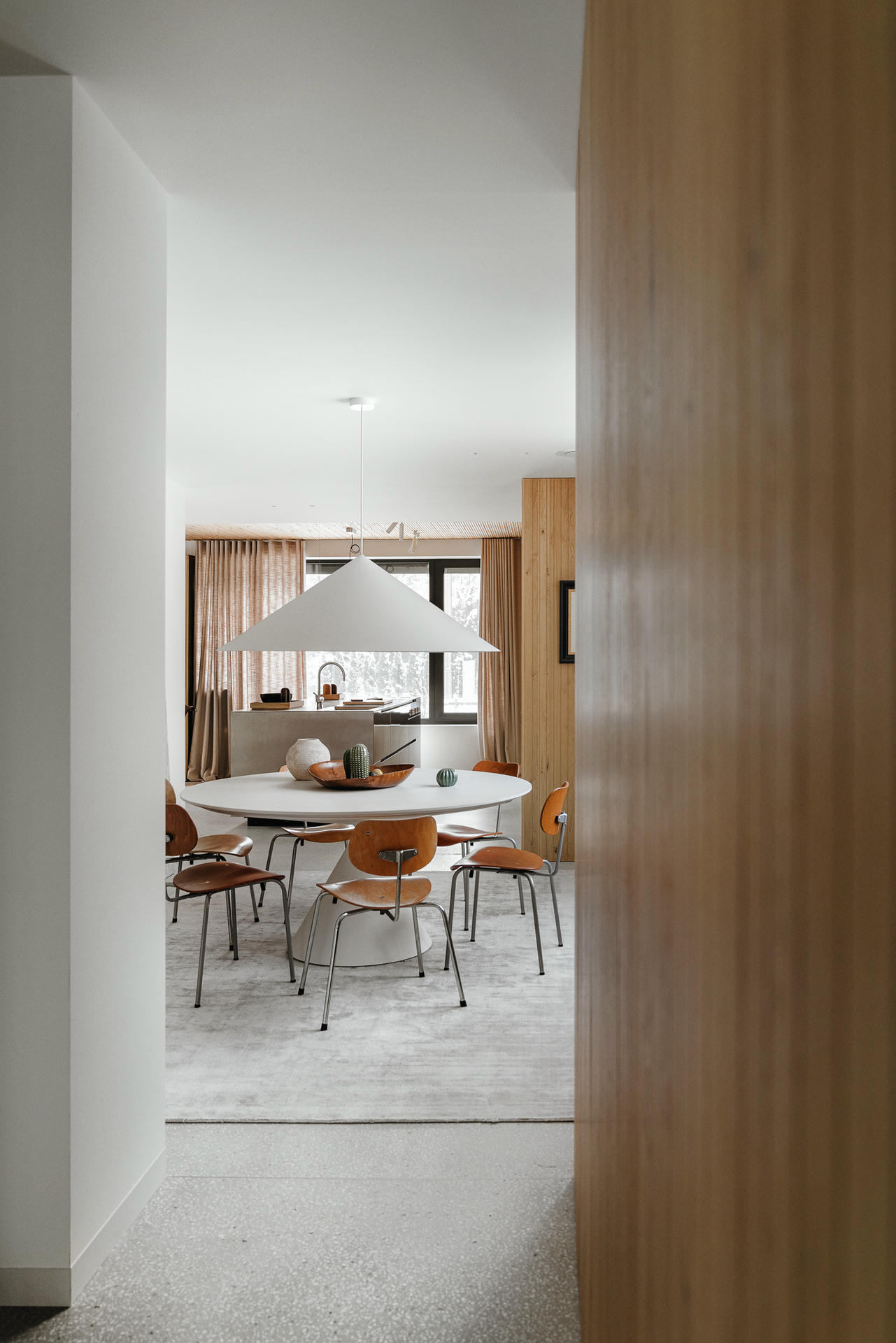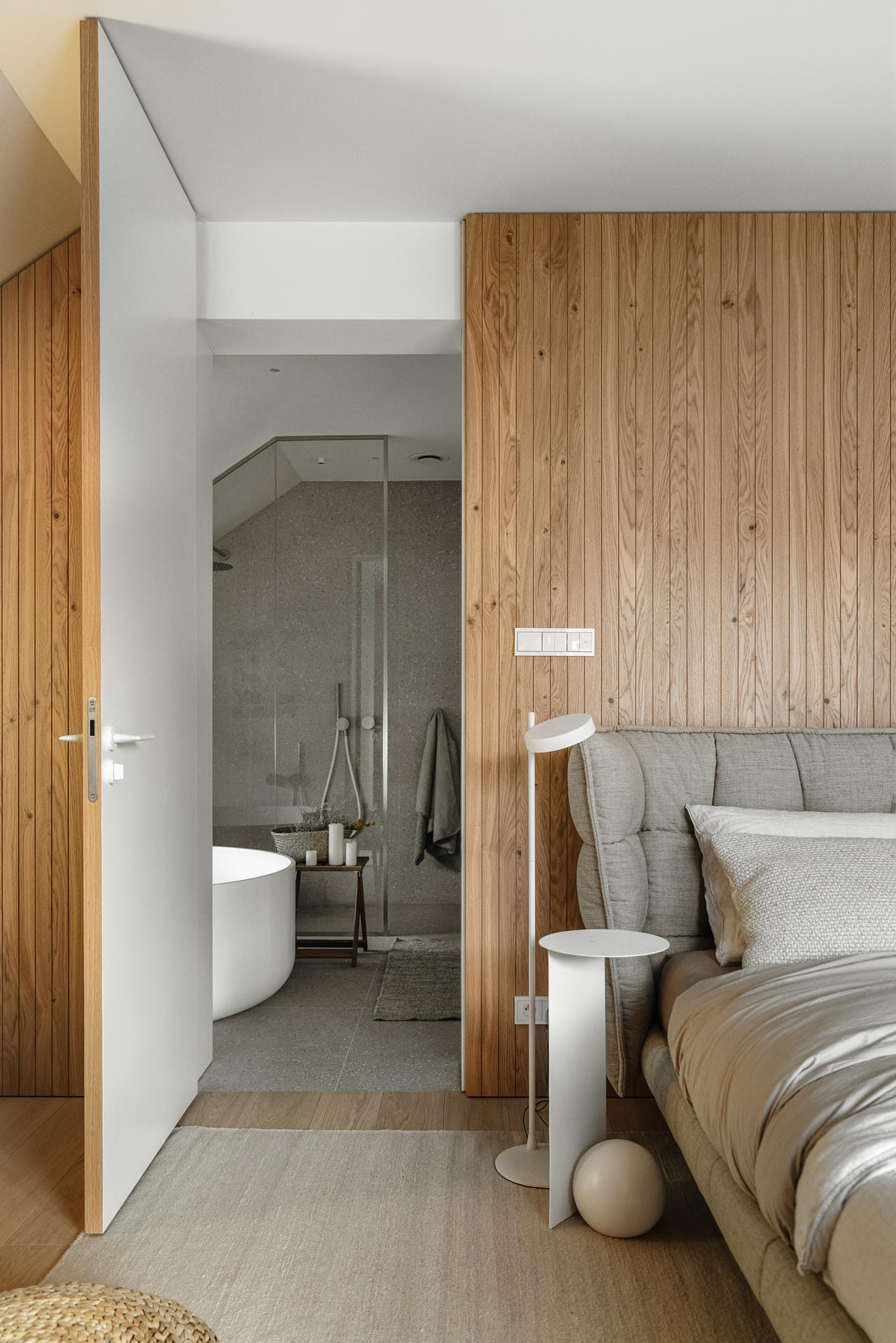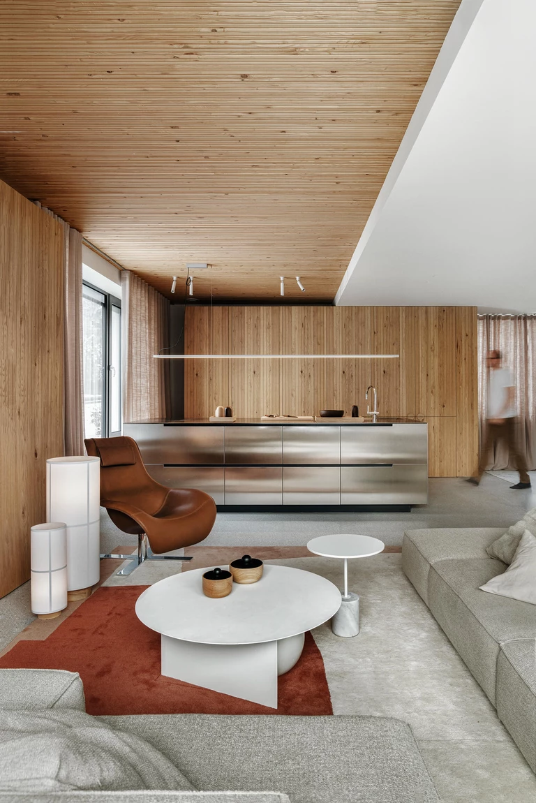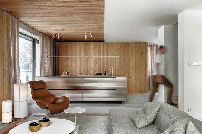 Dom powstał w technologii CLT i architekci zdecydowali się częściowo odsłonić drewniane stropy. Rytm lameli oraz ich kolorystyka zostały powtórzone w okładzinach ściennych i zabudowach meblowych, dzięki czemu wszystko pozostaje spójne. „Zawsze projektujemy tak, by wnętrza łączyły się z architekturą, by nie było przypadku” – dodają projektanci.