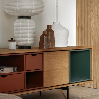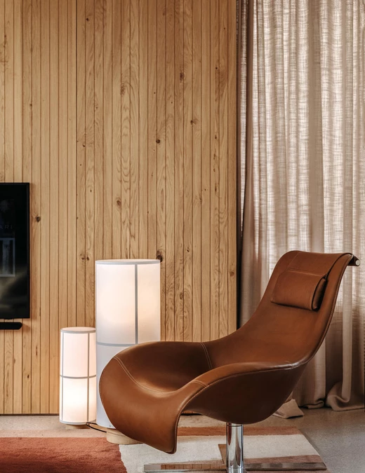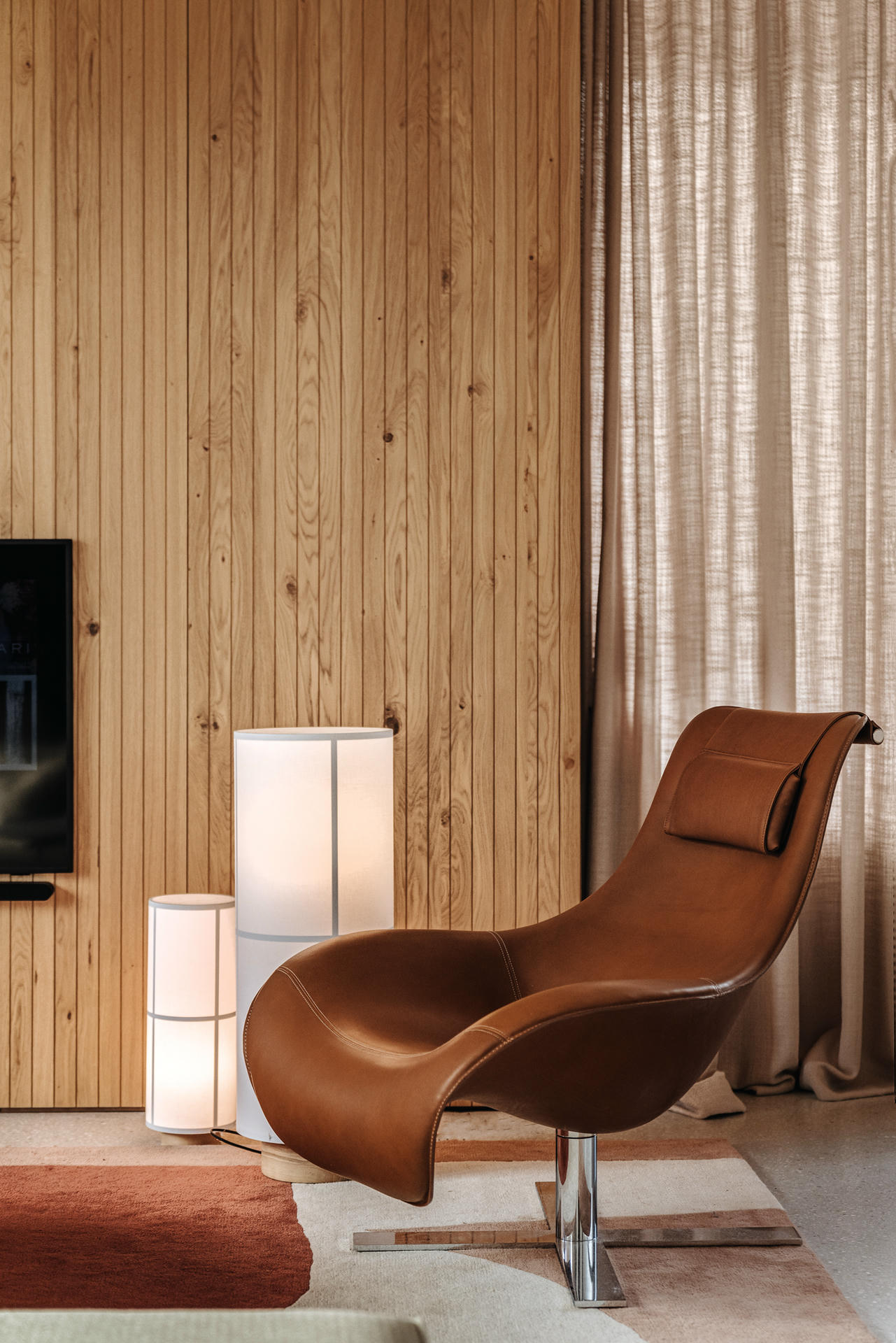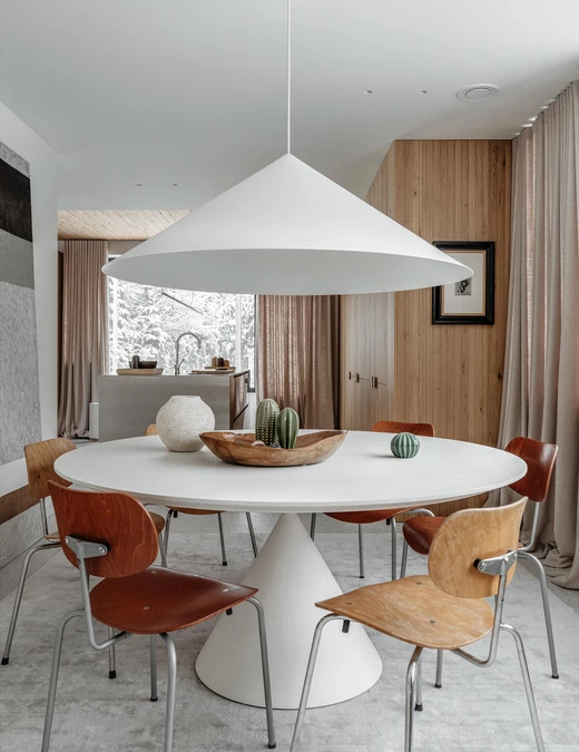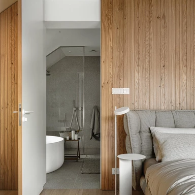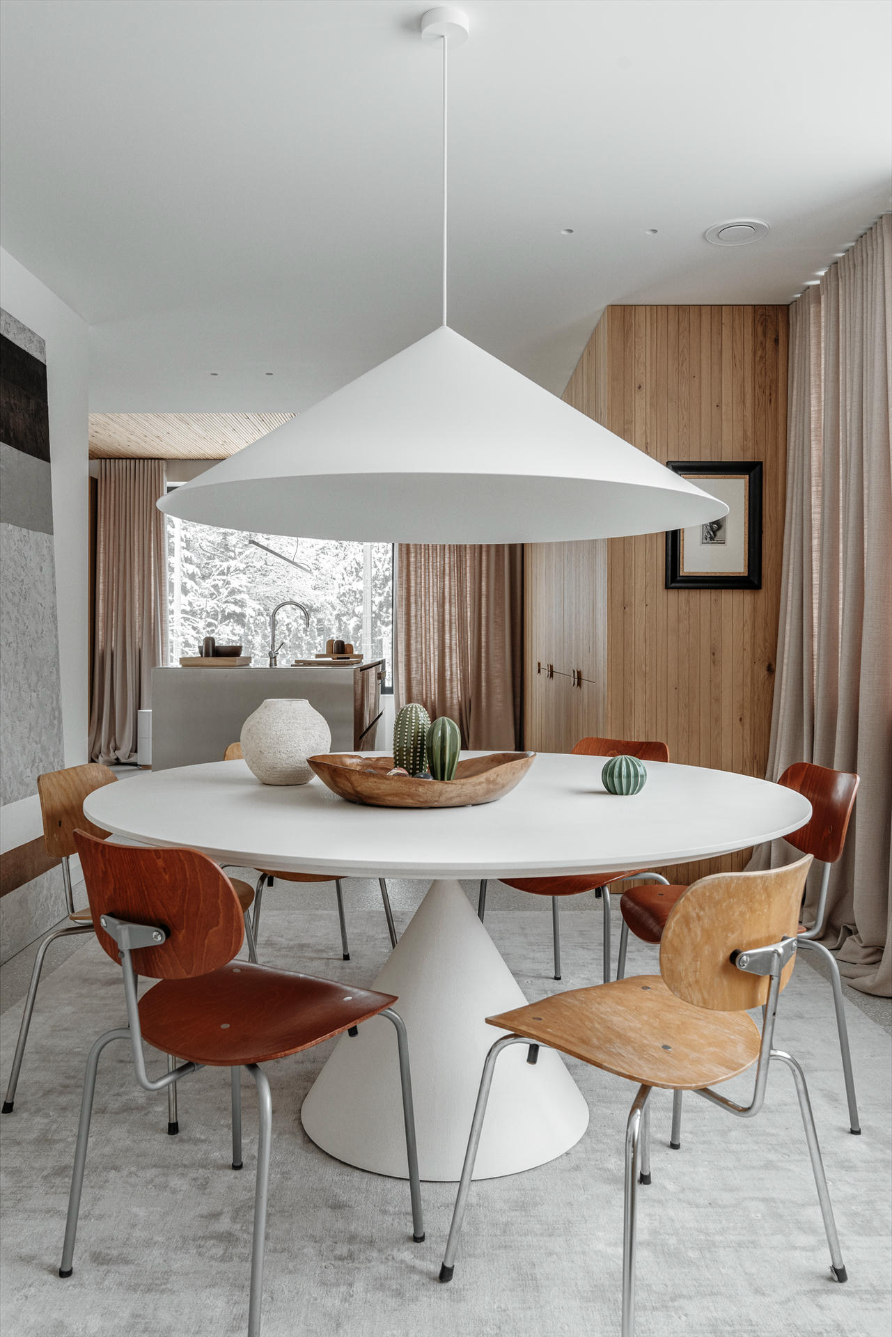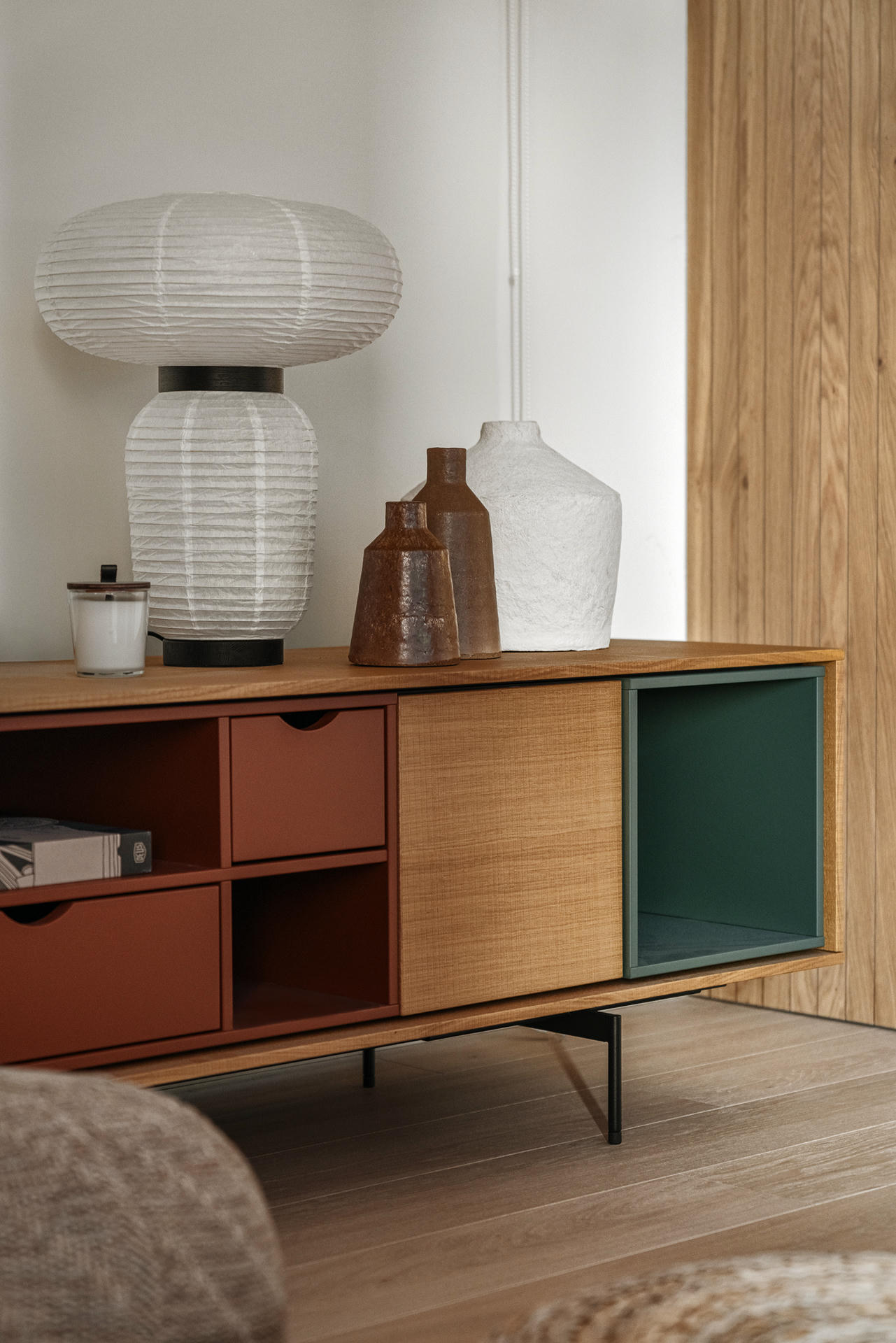 Dom powstał w technologii CLT i architekci zdecydowali się częściowo odsłonić drewniane stropy. Rytm lameli oraz ich kolorystyka zostały powtórzone w okładzinach ściennych i zabudowach meblowych, dzięki czemu wszystko pozostaje spójne. „Zawsze projektujemy tak, by wnętrza łączyły się z architekturą, by nie było przypadku” – dodają projektanci.