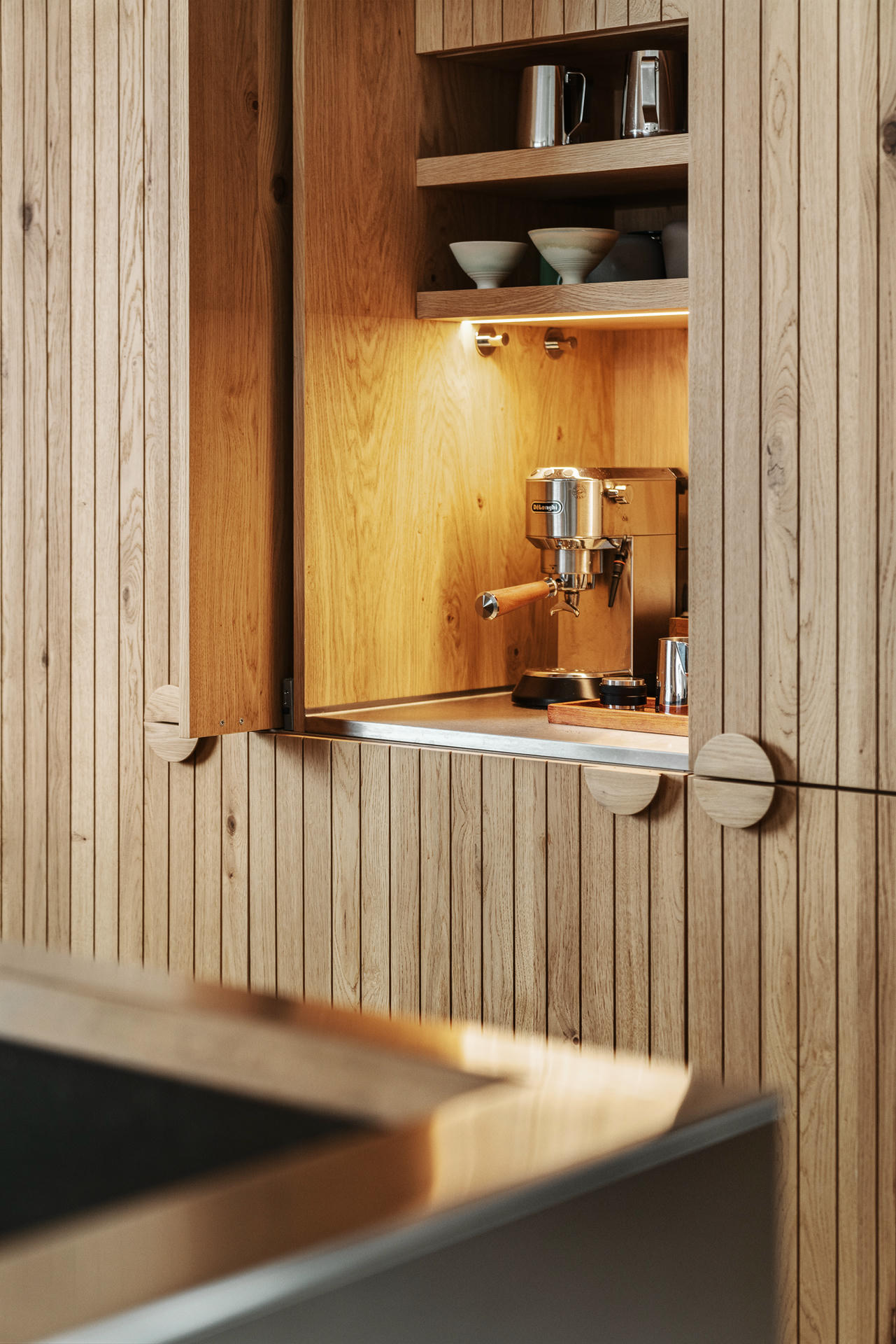 Wysokie szafy kuchenne skrywają dodatkowy blat roboczy na drobne sprzęty oraz profesjonalny piekarnik konwekcyjny. Całość ukryto za wsuwanymi frontami, więc urządzenia pozostają niewidoczne na co dzień i pojawiają się na wierzchu tylko wtedy, gdy stają się potrzebne. Minimalizm nie jest tu jedynie estetyką, ale także przemyślaną funkcją.