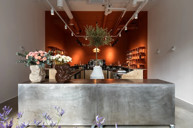 Lokal ma 96 m2 powierzchni. Tuż przy strefie wejściowej na stalowej wyspie znajduje się miejsce na ekspozycję kwiatów, które można kupić w kawiarni.