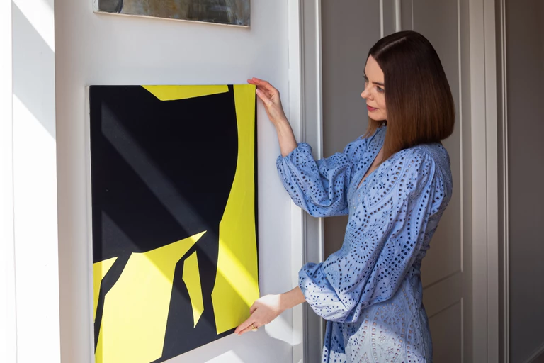 Największą pracą, jaką eksponuję w mieszkaniu, jest obraz przedstawiający ocean z pracowni Grażyny Smalej, z którą współpracuję od początku założenia galerii. To duże płótno, które przejęło całą ścianę nad łóżkiem. Mam też u siebie malutkie obrazy Jakuba Słomkowskiego, Jósefiny Alanko, która dostała niedawno nagrodę Strabag Artaward International, Kasi Feiglewicz-Peszat, Joanny Dudek, grafiki Eweliny Skowrońskiej, prace na papierze Kasi Januszko czy fotografie różnych autorów, z którymi współpracuję. Ostatni mój zakup to płaskorzeźba autorstwa Moniki Urbaniak. Marzy mi się teraz jedna ze szklanych rzeźb Magdaleny Wodarczyk, które obecnie eksponuję w galerii. Większość obiektów z mojej prywatnej kolekcji jest rezultatem prowadzenia galerii sztuki Flow Art House, procesu twórczego przy tworzeniu wystaw i prywatnych spotkań z artystami przy opracowywaniu konkretnych pomysłów na zamówienie dla klientów. Obrazy, które okalają drzwi, to prace Karoliny Pielak i Konrada Peszko, to mój osobisty dyptyk. Choć pochodzą z różnych pracowni, dla mnie bez siebie już nie istnieją. Według mnie sztuka, tak jak branża modowa, jest o miksowaniu. Dobór obiektów ma ogromne znaczenie, bo zmieniamy kontekst, emocje i treść, która jest w nich zapisana. Każdy obiekt sztuki wprowadzony do tego mieszkania jest celebrowany. Co więcej, ja tak samo pracuję z moimi klientami. Gdy przywożę do nich jakąś pracę, to dbam, by mieć czas i przestrzeń na wspólne wypicie kawy, rozmowę, podzielenie się wrażeniami. Chcę, żeby to był moment zatrzymania i poczucia, że coś nowego przybyło do domu. To niemal jak ceremonia powitania, dla mnie niezbędna.
