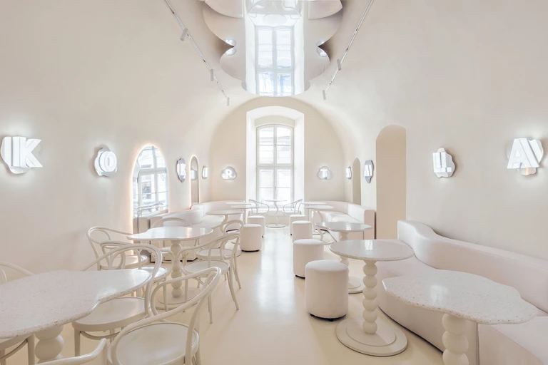 W takie środowisko zostały wkomponowane organiczne, wykonane na zamówienie meble, które sprawiają wrażenie wyrastających z historycznej tkanki. Mnogość luster i elementów z polerowanej stali nierdzewnej nie tylko transferuje światło dzienne w ciemniejsze zakamarki sali, ale i zakrzywia wizualnie geometrię pomieszczeń, przeistaczając historyczne wnętrze w surrealistyczną przestrzeń, rodem z lat świetności nurtu Space Age