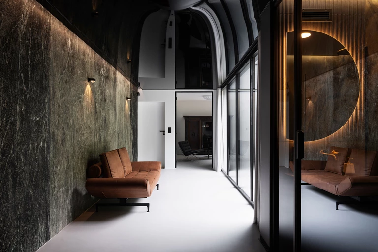Strefa sypialni to teatralna i odważna gra z percepcją, która stanowi świadomy kontrast dla jasnej, otwartej na naturę części dziennej. Ciemny, lakierowany na wysoki połysk sufit odbija przestrzenie tworząc iluzję nieskończonej głębi. Ściana za dużym, tapicerowanym łóżkiem została skomponowana z rytmicznie ułożonych, miękkich paneli. Rozpraszają one światło, budując intymną i zmysłową atmosferę. Ta starannie wyreżyserowana scenografia zamienia sypialnię w luksusowy buduar i osobisty azyl jednocześnie.