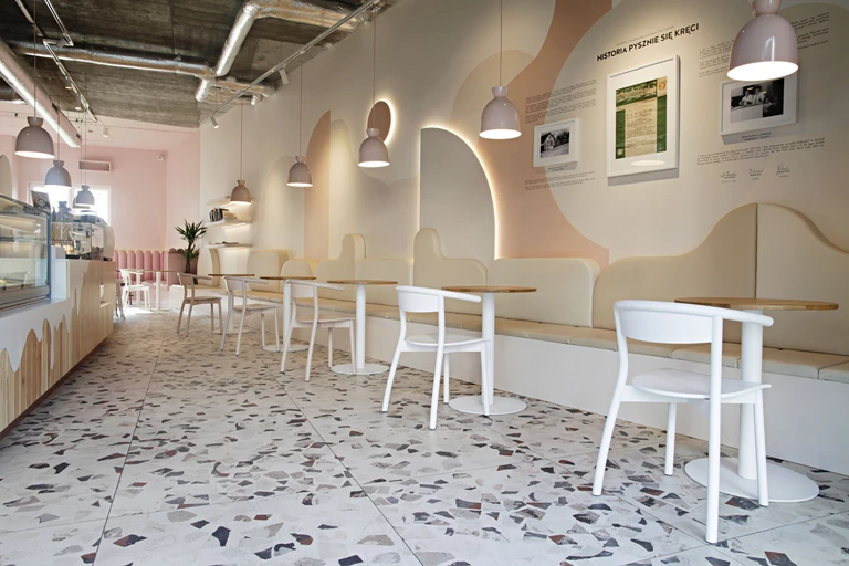 Lewa strona to długa lada, której kolejne sekcje - lody, ciastka, kawa, wciągają klientów do środka. Po prawej znalazła się długa ława ze stolikami. Monotonia ściany pod którą się znajduje, została urozmaicona przez malowane, miękkie kształty w ciepłych, śmietankowych kolorach. Podłużny, nawiązujący do tramwaju kształt lokalu optycznie skrócono przez ostatnią sekcję, która jest strefą zabaw dla dzieci i odpoczynku dla ich rodziców. Ostatnie kilka metrów pomieszczenia wydzielono kolorem różowym.