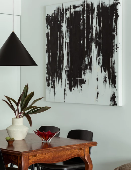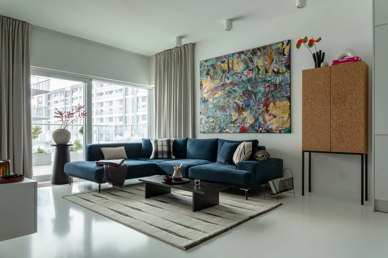 Czarno-białą bazę urozmaicają plamy koloru. W salonie to błękitny narożnik i abstrakcyjny obraz, który zawisł nad nim. To płótno, jak i pozostałe znajdujące się w mieszkaniu, namalowała młoda malarka, Karolina Treler. Wprawne oko wyłapie w salonie także słynną ikonę dizajnu – figurkę Eames House Bird projektu Ray i Charlesa Eamsów.