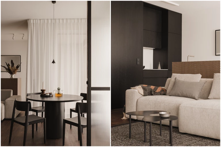 Czerń w tym wnętrzu to mocny akcent. Porządkuje przestrzeń, podkreśla jej walory, wydobywa formy. Projekt tego 55-metrowego mieszkania wykonali Justyna i Patryk Ławrynowicz. Łącząc kilka odcieni brązu i beżu z czernią oraz bazując na drewnie, stworzyli miejsce, które przyciąga spokojem i dyskretną elegancją.