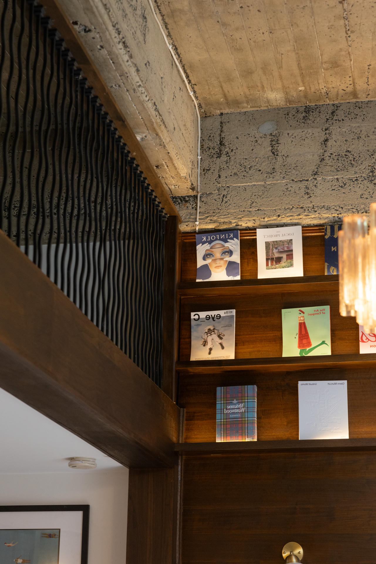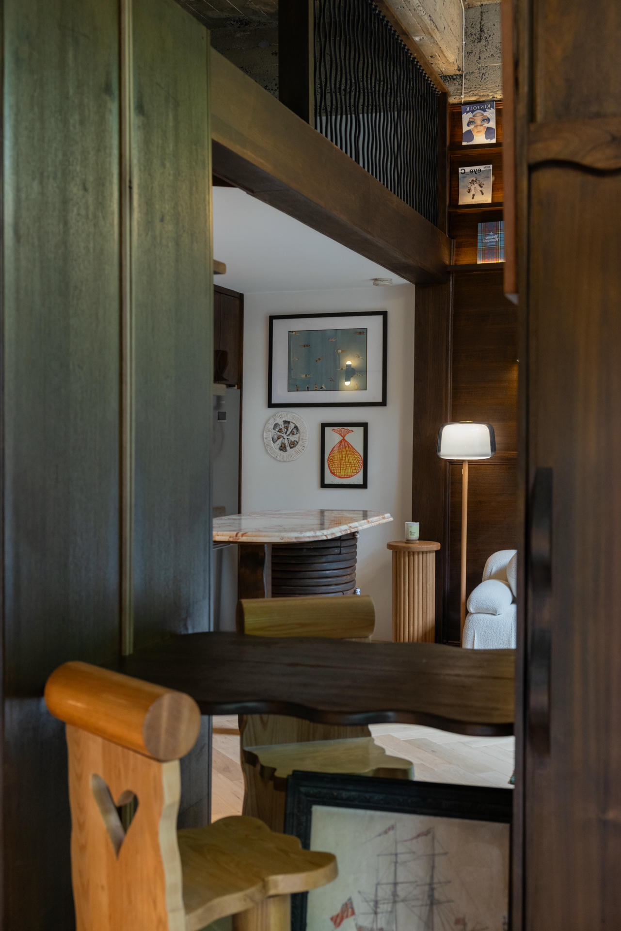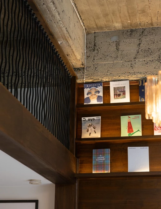 Układ wnętrza jest płynny, a przestrzeń nie została podzielona w tradycyjny sposób – raczej przenika się i naturalnie prowadzi użytkownika przez kolejne strefy. Surowy beton, metal i szkło tworzą tło dla drewnianych elementów, dzięki czemu wnętrze nie traci lekkości mimo wyrazistych materiałów.