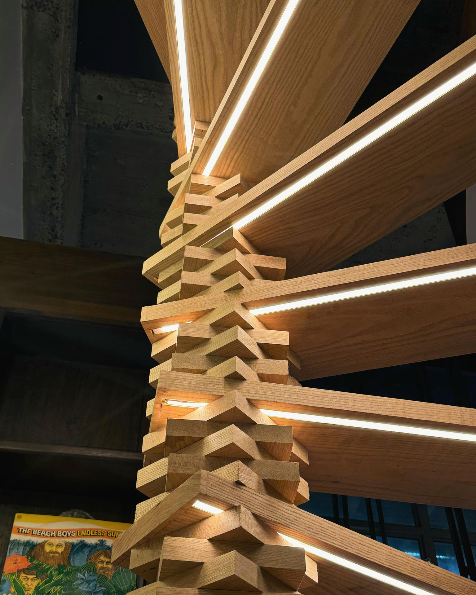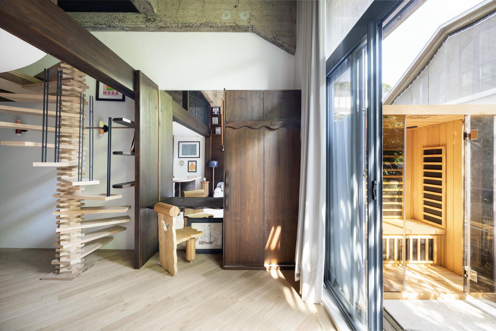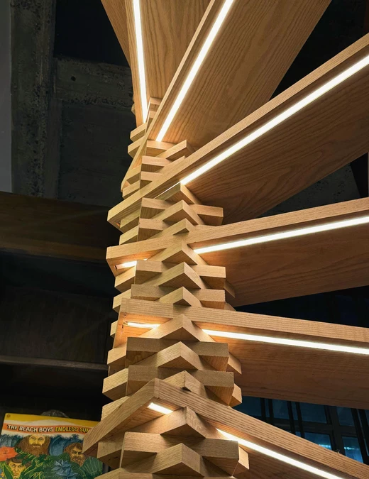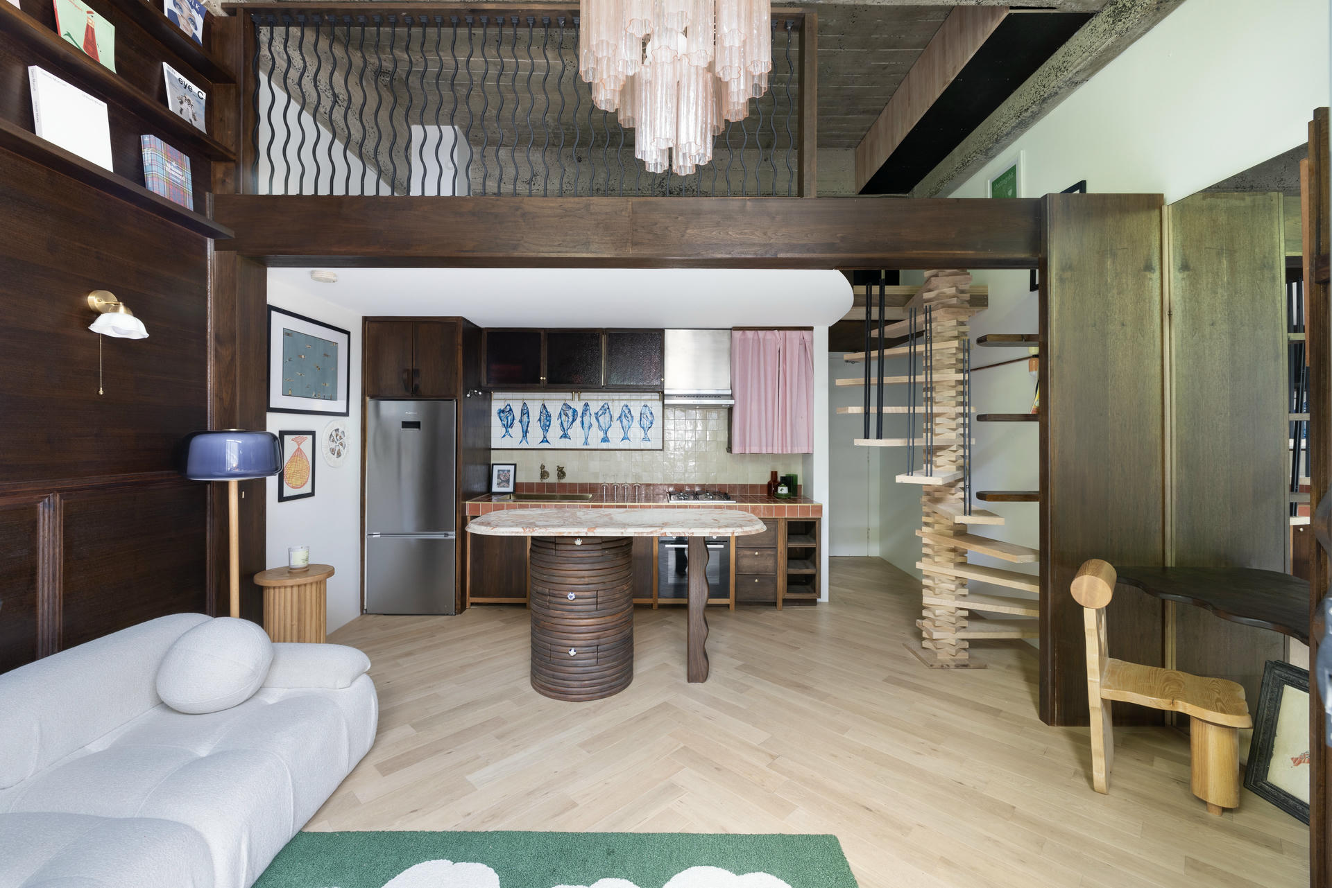 Bazą kompozycji tego wnętrza są trzy gatunki drewna, a centralnym elementem – spiralna klatka schodowa. Jenga Loft, zaprojektowany przez Jonathana Frienda ze studia JFORM, powstał na podwalinie niewielkiego metrażu, sprytnych rozwiązań i podróży do Hiszpanii.