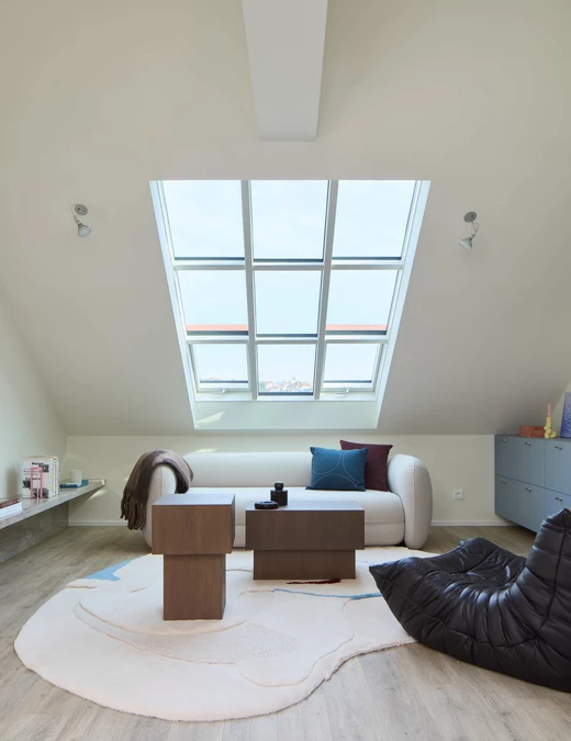 Salon rozciąga się w stronę dużego okna. Usytuowanie na najwyższej kondygnacji zapewnia prywatność i kameralny charakter przestrzeni, a zmieniające się w ciągu dnia światło nadaje jej dynamiki.