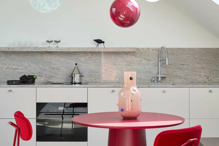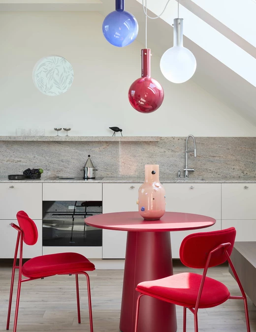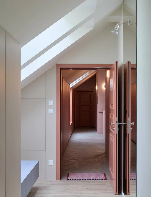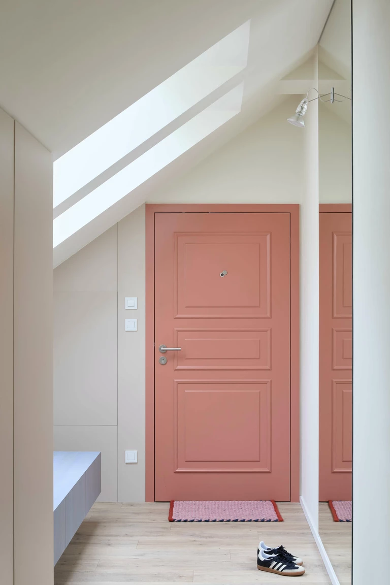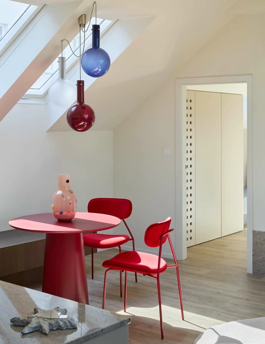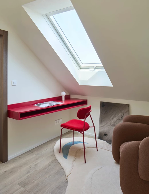 Wnętrze porządkuje konsekwentnie stosowana paleta trzech kolorów: czerwieni, jasnego błękitu i kaszmiru. Barwy te nie tylko dzielą przestrzeń na strefy, ale też prowadzą wzrok i podkreślają detale. W projekcie powracają motywy wykorzystane przez projektantki w częściach wspólnych budynku: kamień i drewno, okrągłe świetliki oraz perforowane drzwi.