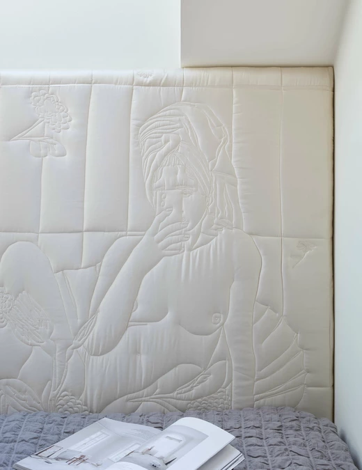 Natomiast lustrzana zabudowa ukrywa sypialnię. Jej dominantą jest zagłówek łóżka w formie haftowanego, satynowego obrazu przedstawiającego współczesną Wenus. Wzdłuż skosu dachu poprowadzono zabudowane szafy, które porządkują przestrzeń, ale jej nie przytłaczają.
