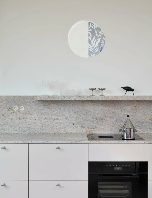 Dalej znajduje się minimalistyczna zabudowa kuchenna, dyskretnie wpisana w przestrzeń. Kamienny blat Ivory Fantasy pojawia się w różnych miejscach apartamentu, spinając całość niczym estetyczna klamra. Zamiast klasycznego okapu zastosowano tu nietypowe rozwiązanie: świetlik z trawionego szkła, który otwiera widok i dodatkowo doświetla wnętrze.