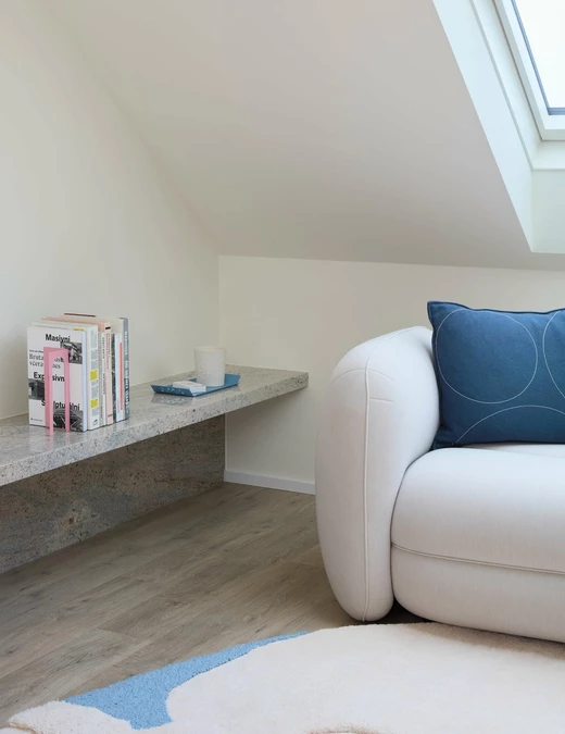 Głównymi założeniami projektowymi było zapewnienie maksymalnego dostępu do światła naturalnego oraz funkcjonalne uporządkowanie nieregularnej przestrzeni pod skosami dachu. Efektem jest spokojne, komfortowe mieszkanie blisko centrum miasta, które oferuje warunki zarówno do odpoczynku, jak i pracy.