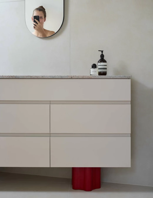 Łazienka utrzymana w ciepłej, kaszmirowej tonacji została zaprojektowana wokół wolnostojącej wyspy z kamienną umywalką i pojemnymi szufladami. Całość domyka lustro z subtelnym detalem w postaci aluminiowych odlewów, podkreślające rzemieślniczy charakter wnętrza.