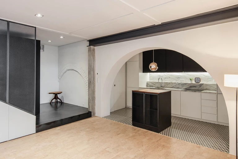 Stan istniejący pozostał niezmieniony z wyjątkiem tylnej elewacji, która została otwarta tak, aby wpuścić do przestrzeni jak najwięcej naturalnego światła dziennego, wzmacniając przy okazji relację między wnętrzem a zewnętrzem. Wprowadzenie dwóch prostych kubatur wydzieliło funkcje potrzebne do prawidłowego funkcjonowania mieszkania. Czarny kubik, wykonany z barwionych paneli z włókien drewnianych, wyodrębnił strefę techniczną ze schowkiem. Korkowy kubik, wykończony ciepłymi, akustycznymi panelami korkowymi, wyodrębnił strefę prywatną mieszkania - sypialnię połączoną bezpośrednio z zewnętrznym patio. Obie kubatury wykonane zostały z trwałych, ekologicznych i lokalnych materiałów.