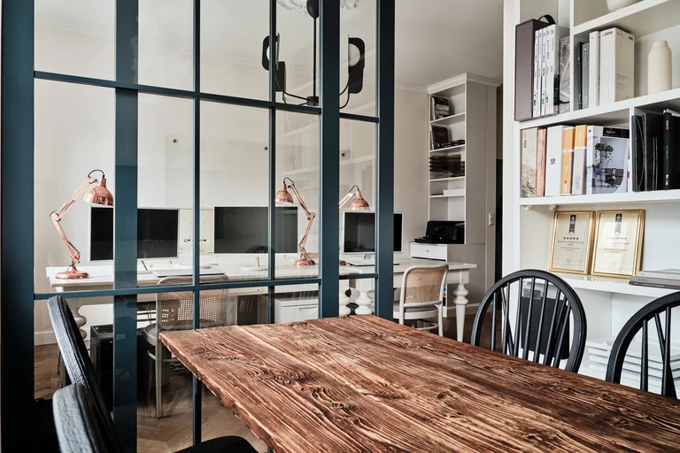 Oto kawałek Paryża pod warszawskim niebem, a jednocześnie przestrzeń wyjątkowych kontrastów stylistycznych. Mamy tu kolejny dowód na to, że w świecie nowoczesnego eklektyzmu pracownia Loft Factory czuje się jak ryba w wodzie. Spójrzmy – pod modernistycznym wąskim przeszkleniem pojawiły się wytworne sztukaterie. Niżej stanęła elegancka zabudowa z kasetonowymi frontami i polerowanym marmurowym blatem, ale zaraz obok kolejny stół z rozbiórkowego drewna.