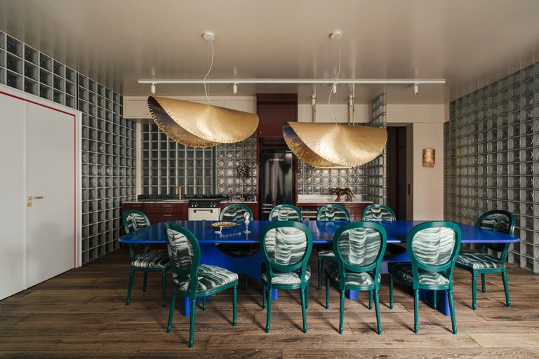 Do wody nawiązuje też długi kobaltowy stół, którego kształt zdaniem projektantki przypomina wyżłobione koryto rzeczne. Mebel otaczają szmaragdowe krzesła, pokryte tkaniną Pierre Frey z wzorem fal.