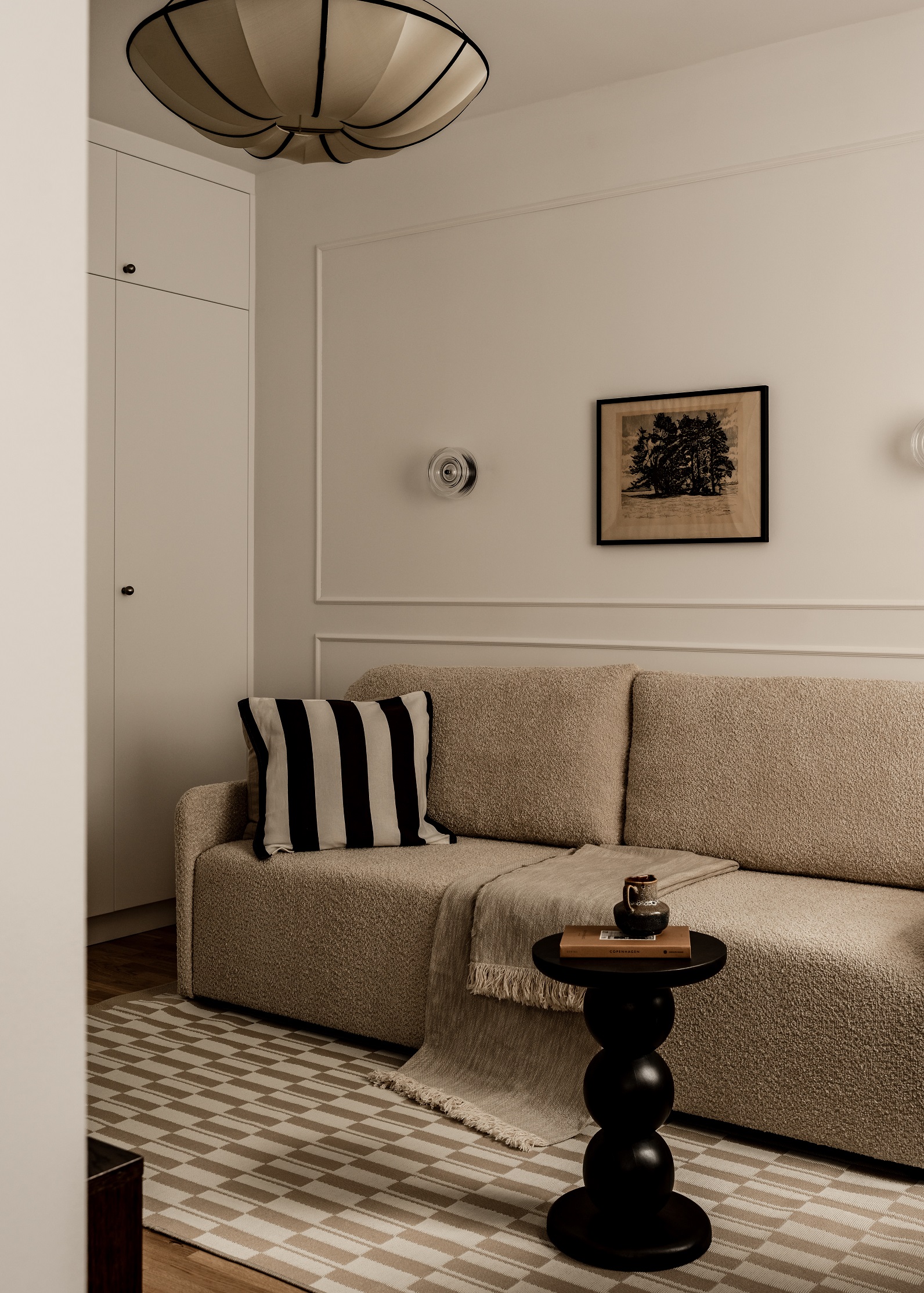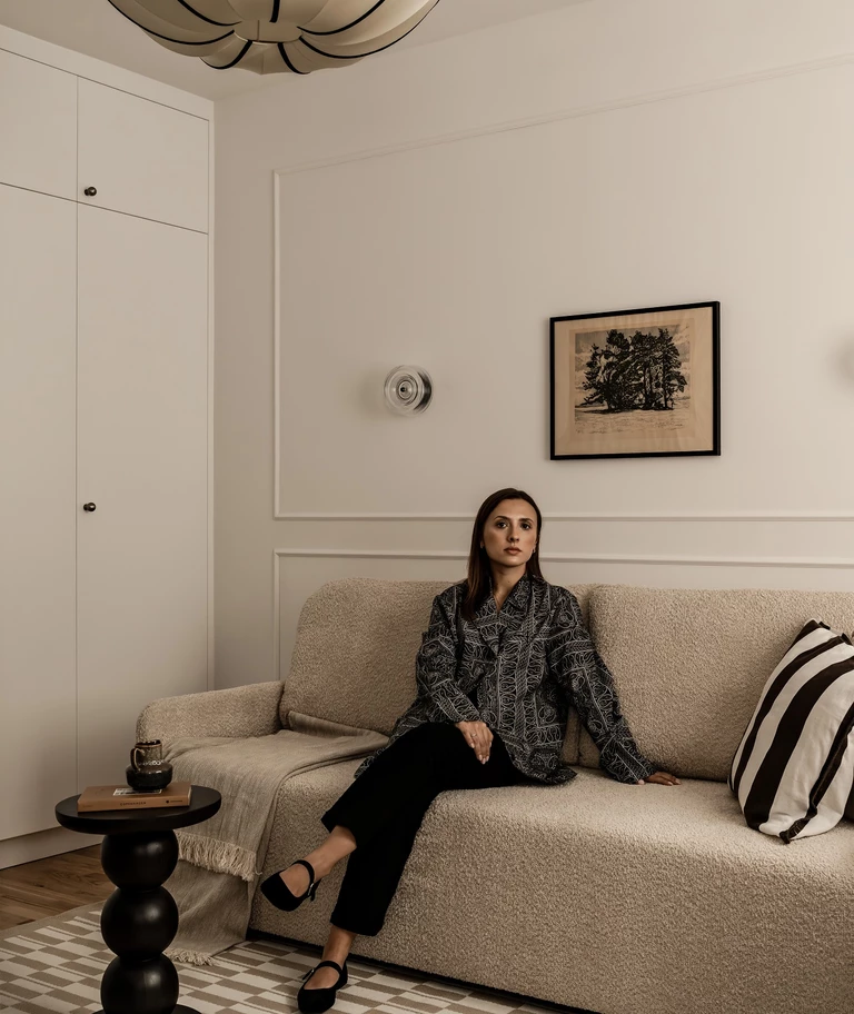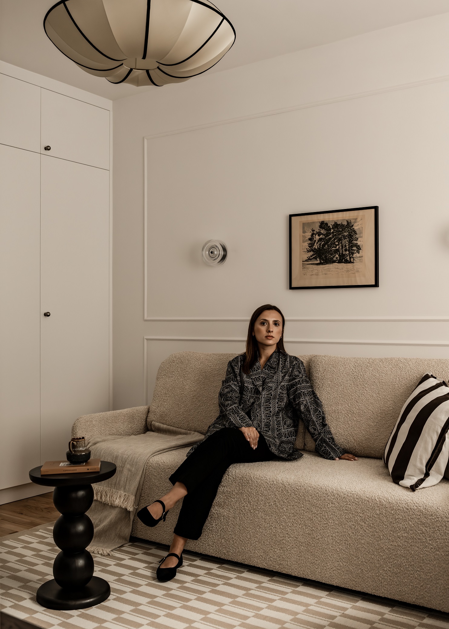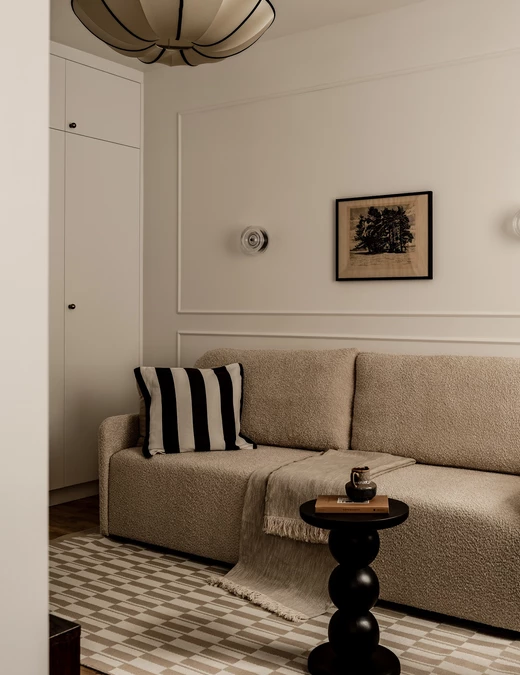 Na podłodze leży dywan z geometrycznym wzorem, powtarzającym motyw z kuchni i przedpokoju. Całość uzupełniają uważnie dobrane dodatki i niemal stuletnia grafika kupione na targu staroci – przedmioty, które nadają wnętrzu indywidualnego charakteru.